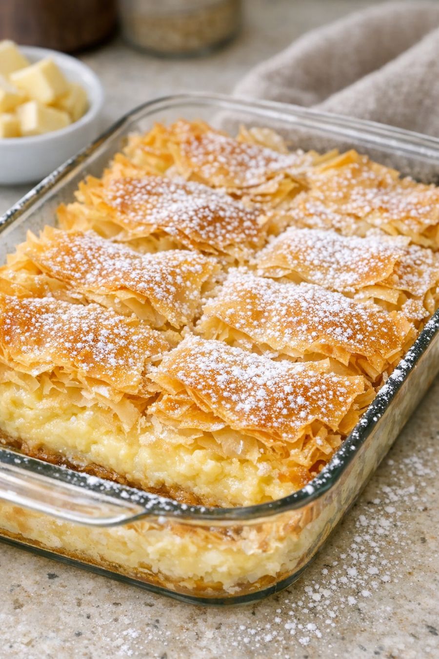 This little layered dessert reminds me of the kind of thing Midwestern church ladies used to pull together when unexpected company rolled up the driveway. It uses frozen phyllo sheets straight from the box and just three other pantry friends to make a buttery, custardy, crackly-topped treat that disappears fast. You don’t fuss with syrup or stovetop work—just dump, layer, and bake. The fragile phyllo bakes up into golden, irregular layers that soak up a sweet vanilla cream, and the whole pan looks far fancier than the effort it takes. It’s the sort of recipe you make once and then keep in your back pocket for busy holidays, potlucks, or those evenings when you want something warm and homemade without dirtying half the kitchen.