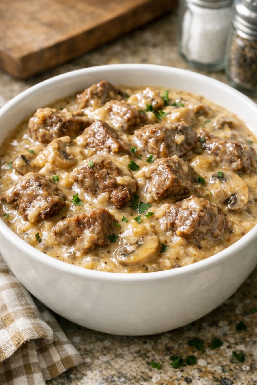 You can tailor this simple recipe to suit your family and what you have in the pantry. For a creamier gravy, stir in 1/4 to 1/2 cup of sour cream or plain Greek yogurt right at the end of cooking, off the heat, to keep it from curdling. If you’d like some vegetables in the pot, scatter 2 to 3 cups of hearty veggies—such as baby carrots, thick-sliced onions, or chunked potatoes—over the raw beef before you pour on the soup mixture; just be sure not to overfill your slow cooker. For a deeper beef flavor, you can substitute a can of condensed cream of celery soup or cream of onion soup for the cream of mushroom, or use a richer beef broth in place of water. If your husband or guests prefer a thicker gravy, whisk 1 tablespoon of cornstarch with 1 tablespoon of cold water, stir it into the hot juices at the end, then cover and cook on HIGH for 15 minutes more until thickened.