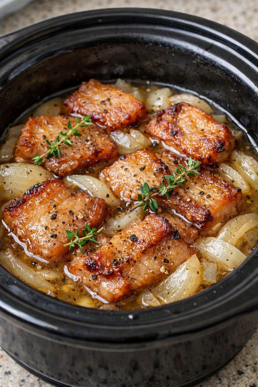 Taste a small piece and, if needed, adjust the seasoning with a light sprinkle of additional seasoned salt or black pepper. Serve the pork and onions hot, spooning a bit of the savory broth over each portion just before taking it to the table.