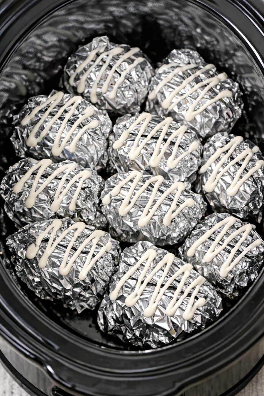 Without unwrapping the packets, drizzle the warmed icing directly over the tops of the foil packets in the slow cooker so you get a casual, messy zigzag on each one. The black slow cooker makes the silver foil and white drizzle really pop.
