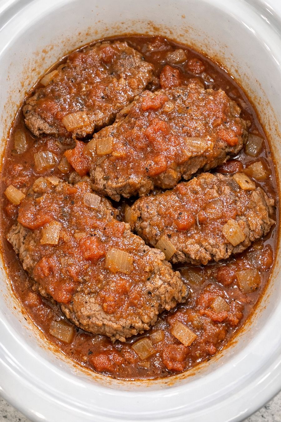 For a flavor boost without adding more ingredients, lightly brown the steak pieces in a hot skillet with a thin film of oil before placing them in the slow cooker; that bit of browning adds a subtle roasted note to the final gravy. If you want a hint of herbiness while keeping things simple, add 1 teaspoon of dried Italian seasoning or dried thyme to the tomato soup mixture before pouring it over the meat. For a slightly sweeter, more kid-friendly sauce, stir 1 to 2 teaspoons of sugar into the soup mixture to soften the acidity of the tomatoes. You can also add 1 sliced green bell pepper along with the onions for a more classic diner-style Swiss steak profile, or stir in a splash of Worcestershire sauce at the end for depth. To thicken the gravy further, remove the cooked meat and tent it with foil, then turn the slow cooker to HIGH and let the sauce simmer uncovered for 10 to 15 minutes, or whisk 1 tablespoon of cornstarch with 2 tablespoons of cold water and stir it into the hot sauce, cooking until slightly thickened. For food safety, use fresh beef that has been stored below 40°F (4°C), wash your hands and cutting board thoroughly after handling raw meat, and be sure the dish reaches a safe internal temperature of at least 145°F (63°C), though in practice you’ll be cooking well beyond that for tenderness. Do not leave the finished dish at room temperature for more than 2 hours; refrigerate leftovers promptly in shallow containers and reheat until steaming hot before serving.