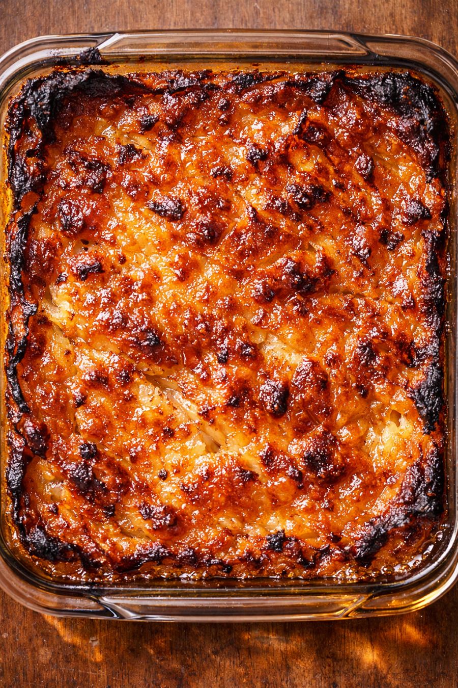 Rest before serving: When the top is deeply bronzed and the edges are very crisp, remove the dish from the oven. Let it rest for at least 10–15 minutes. The bubbling fat will settle, the layers will firm up enough to cut, and the fibrous interior will hold together while the top stays shatteringly crisp.