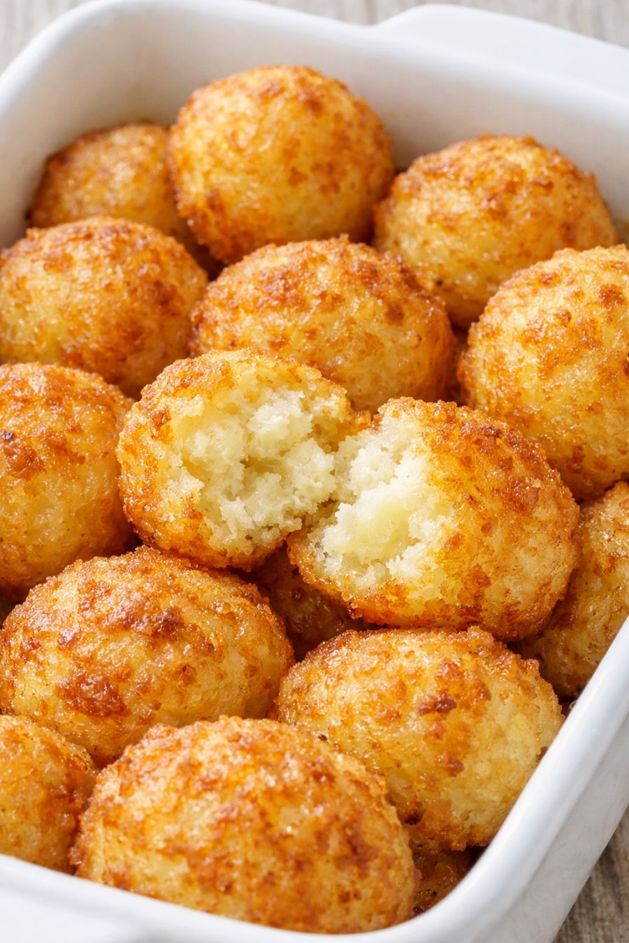Taste and sprinkle lightly with salt and freshly ground black pepper if needed. Serve hot, scooping the crispy potato puffs straight from the casserole dish with a large spoon so you get both the fluffy centers and the crunchy, cheesy edges in every serving.