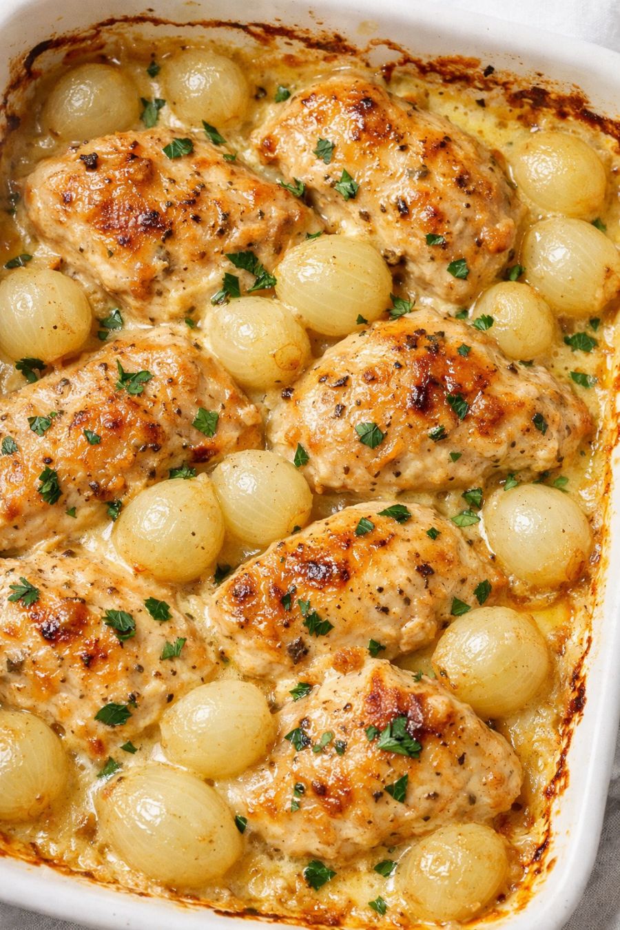 Let the casserole rest for 5–10 minutes out of the oven so the sauce can settle and slightly thicken. Serve the chicken with plenty of the creamy onion sauce spooned over the top and around each piece.
