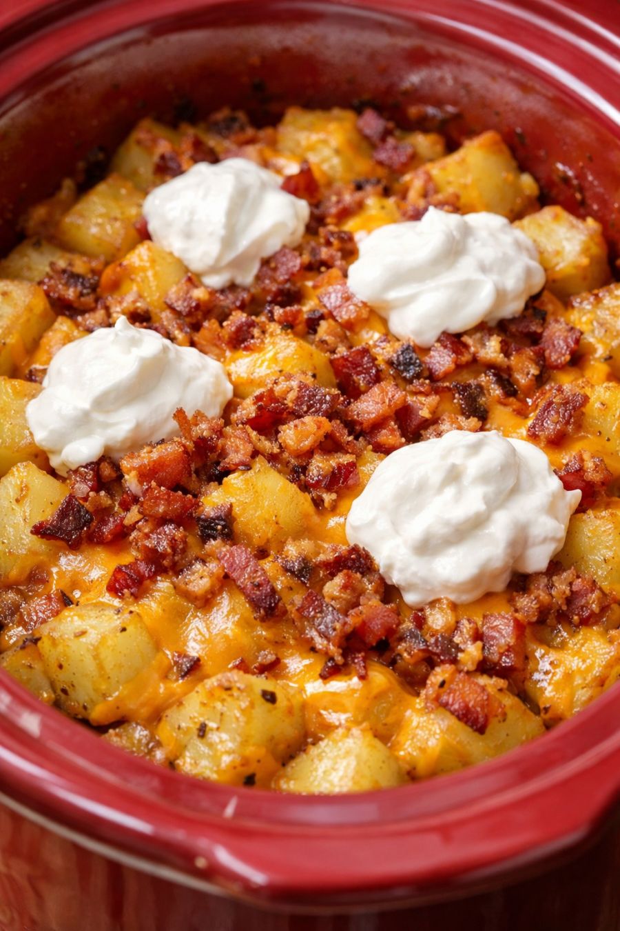 Cover the slow cooker with the lid and cook on LOW for 4 to 5 hours, or on HIGH for 2 to 3 hours, until the potatoes are tender all the way through and the edges are bubbling. Avoid lifting the lid during the first couple of hours so the heat stays consistent.