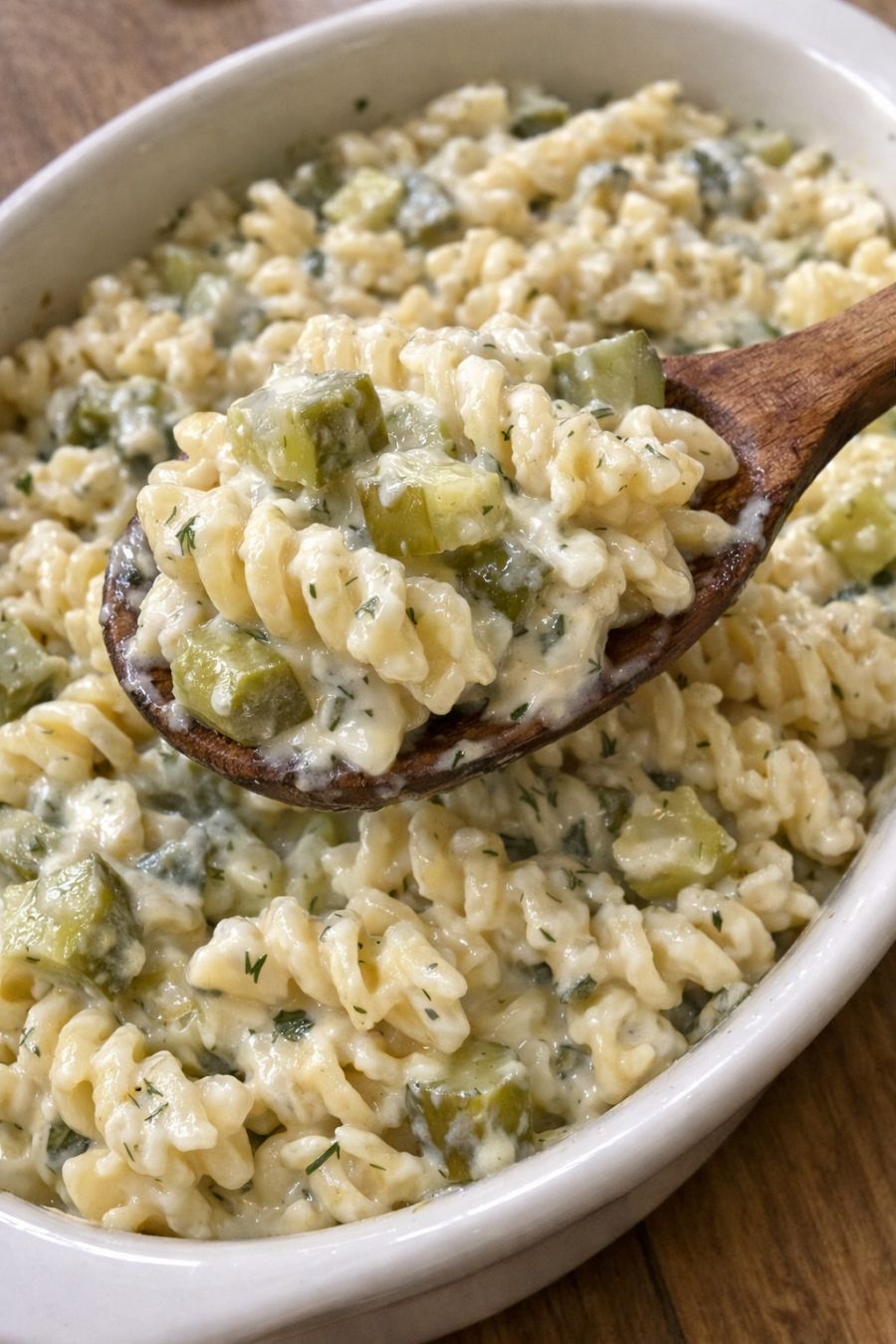Let the casserole rest for about 5 minutes before serving so the sauce can thicken slightly. Scoop it out with a wooden spoon, making sure each serving has plenty of dill pickle chunks and creamy sauce clinging to the noodles.