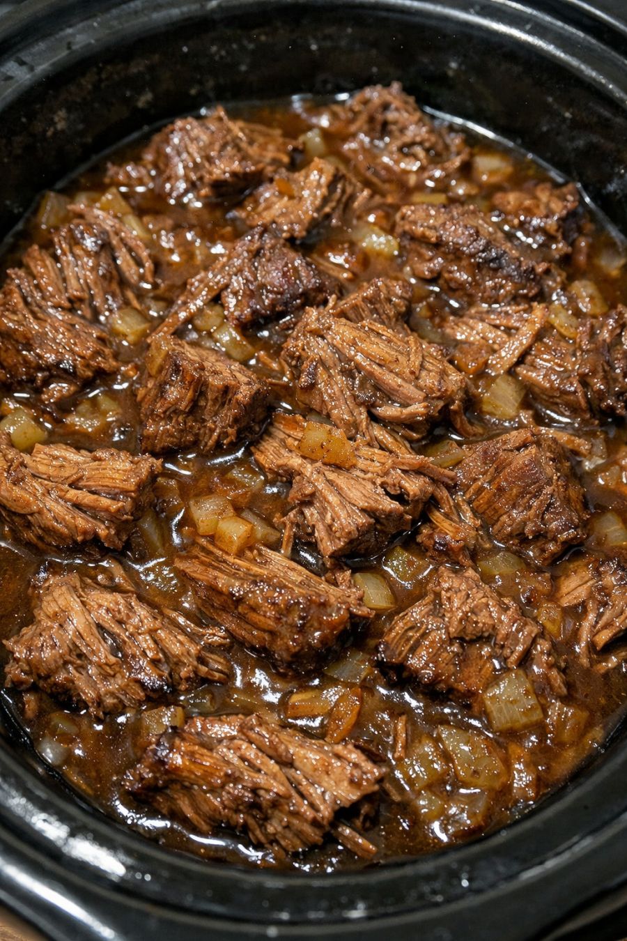 Use two forks to gently pull the roast into large, rustic chunks or shreds right in the slow cooker, stirring to coat the meat with the onion gravy. The onions should be soft and caramelized-looking, mingling through the glossy brown sauce.