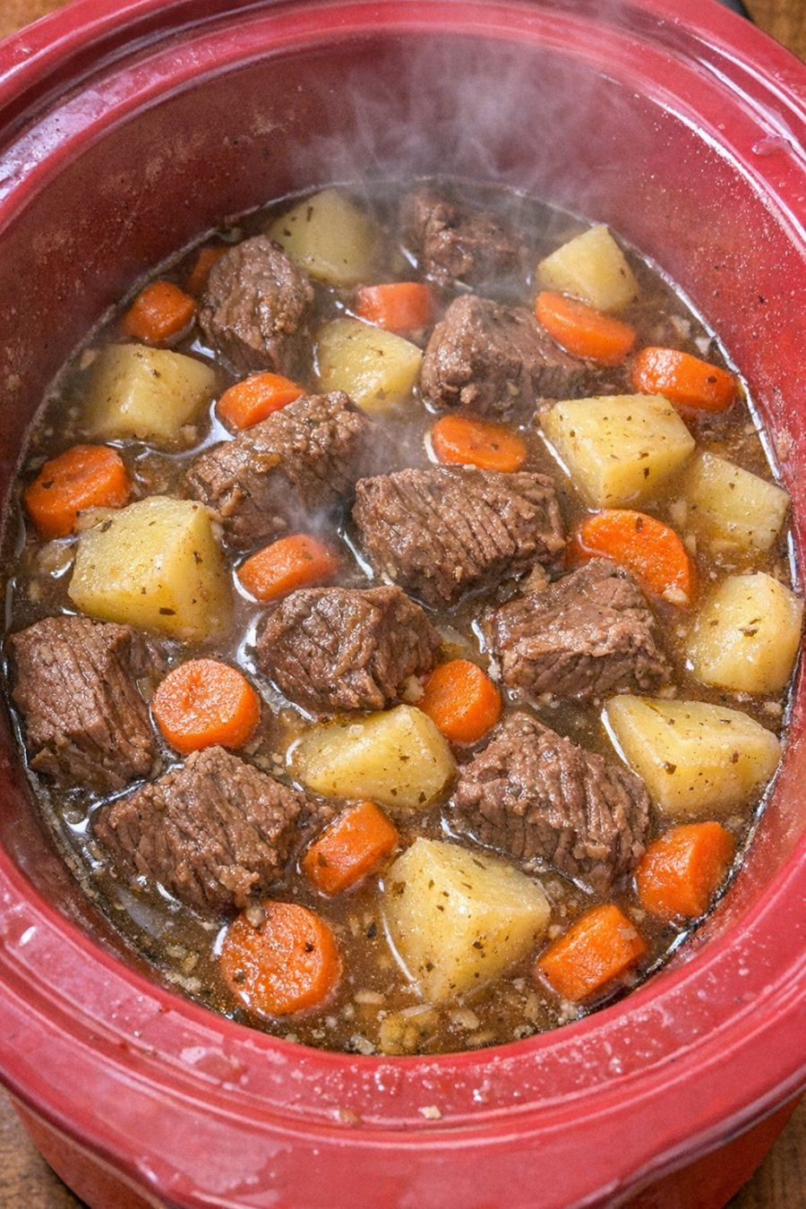 Cook low and slow: Cover the slow cooker with the lid. Cook on LOW for 8 to 10 hours, or on HIGH for 4 to 5 hours, until the beef is fork-tender and the potatoes and carrots are very soft. The broth should be clear, light brown, and aromatic, with a gentle steam rising when you lift the lid.