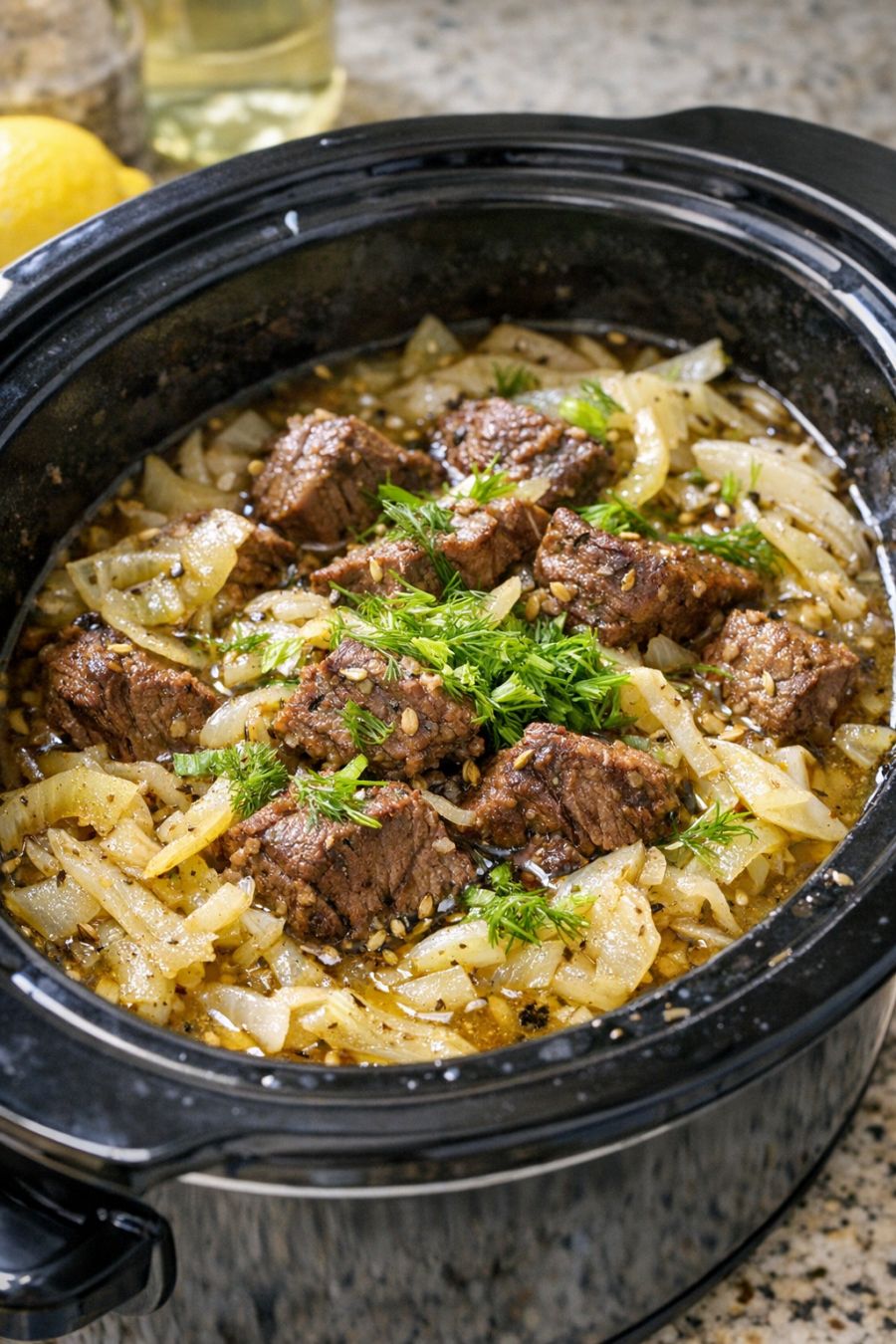 Adjust seasoning and texture: Once the beef is tender, taste the broth. If it needs more brightness, stir in an extra squeeze of lemon juice. Add a pinch more salt or pepper if needed. For a slightly thicker sauce, in a small bowl whisk together the cornstarch and cold water until smooth, then stir this slurry into the slow cooker. Turn the slow cooker to HIGH (if it isn’t already) and cook, uncovered, for 10–15 minutes until the sauce lightly thickens.