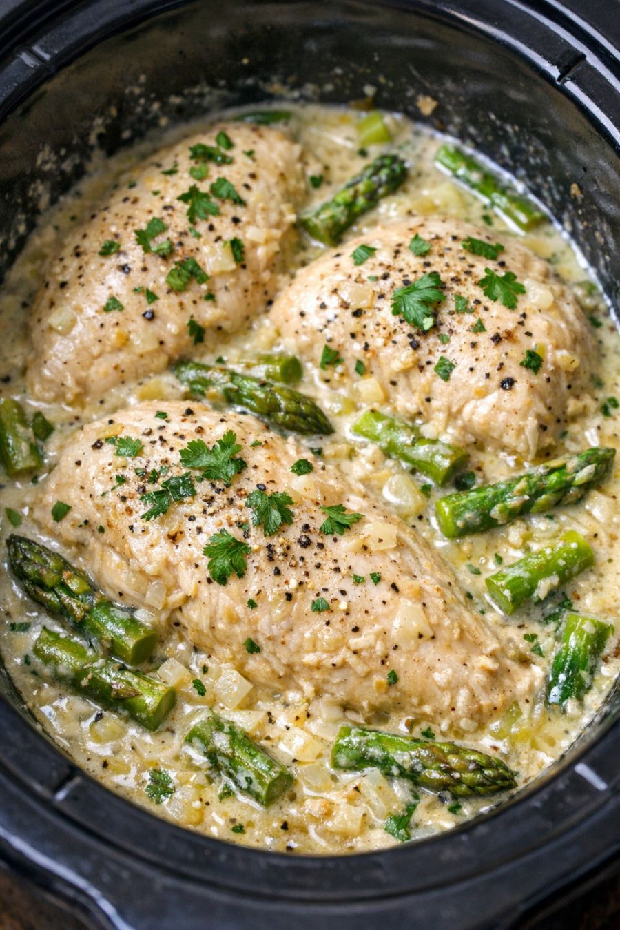 If you’d like a slightly lighter dish, you can replace half of the cream of asparagus soup with low-sodium chicken broth or evaporated milk; the sauce will be thinner but still comforting. For added vegetable presence, stir in 1 to 2 cups of thawed frozen cut asparagus or peas during the last 30 minutes of cooking so they warm through without turning mushy. A small handful of chopped fresh parsley or dill stirred in at the end brightens the richness nicely. If you prefer dark meat, boneless, skinless chicken thighs work well and stay especially moist; they may need a bit less time on LOW, so start checking around the 4-hour mark. For a creamier, more gravy-like finish, whisk in 2 to 3 tablespoons of sour cream or plain Greek yogurt after cooking, off the heat, to avoid curdling.