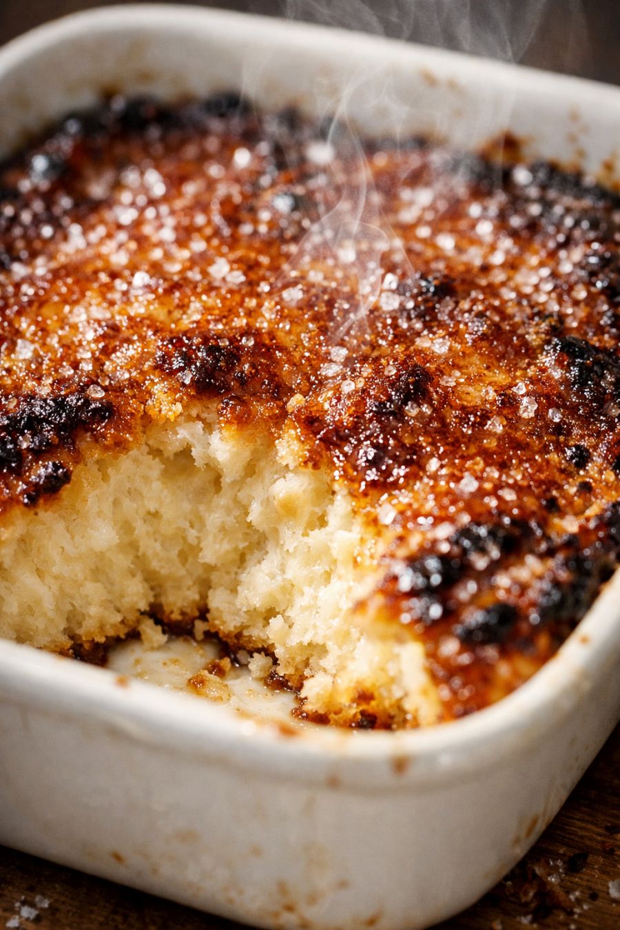 Remove the dish from the oven and let it stand on a cooling rack for at least another 15–20 minutes before serving. As it cools, the top will stay shiny and caramelized, and the interior will thicken to a soft, cloud-like texture. Serve warm, scooping straight out of the dish so everyone can see the contrast between the deeply caramelized top and the tender inside.