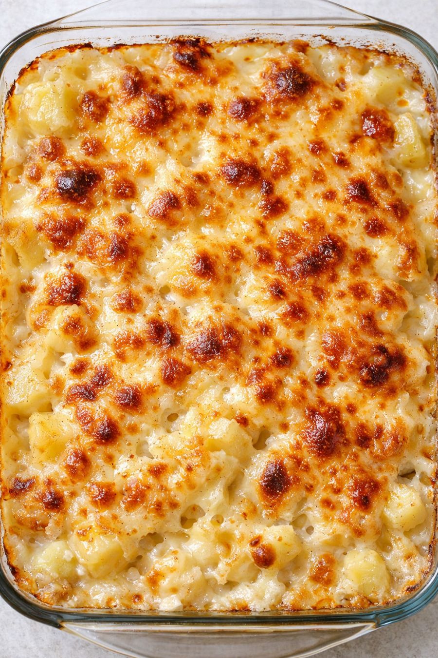 This is the potato bake that made the rounds at every church potluck I grew up going to in the Midwest. It always disappeared before the desserts, and nobody could quite figure out why it tasted so much better than all the other cheesy potatoes on the table. Years later, my next-door neighbor finally admitted that it was her pan all along and shared her “secret” version with me: just four ingredients, all pantry-friendly, stirred together and baked until bubbly with a golden brown cheese crust. It’s the kind of comforting, no-fuss casserole you can throw together after work or double for a party without stressing about a long ingredient list.