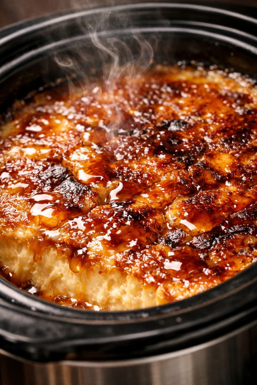 Once done, turn the slow cooker to WARM and let the dessert rest, covered, for about 15 minutes. This helps the layers settle into a lush, creamy texture while keeping the top slightly caramelized.