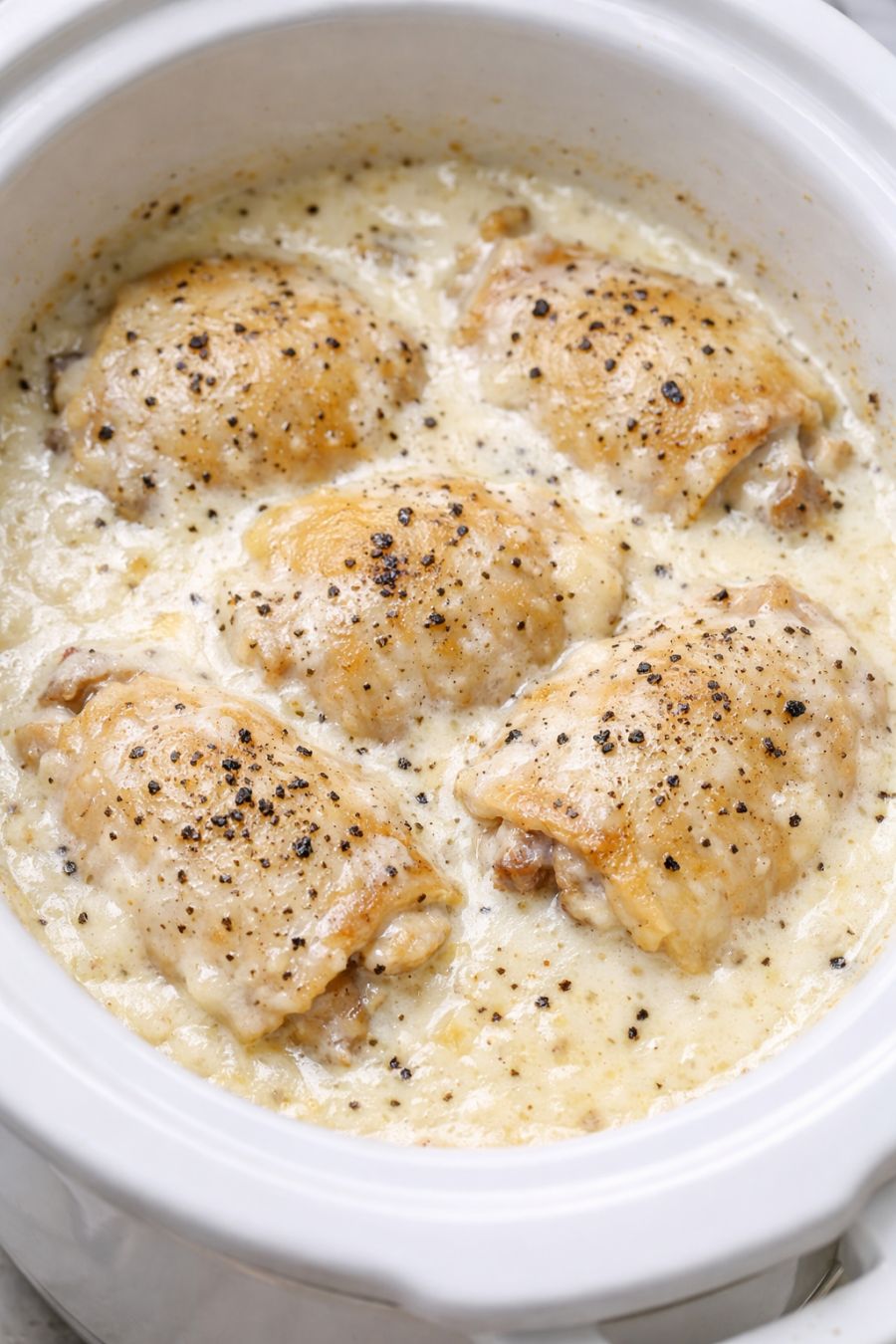 Serve the chicken thighs straight from the slow cooker, spooning plenty of the creamy white gravy over the top. Finish with an extra crack of black pepper right before serving to match that cozy, farmhouse-style look and aroma.