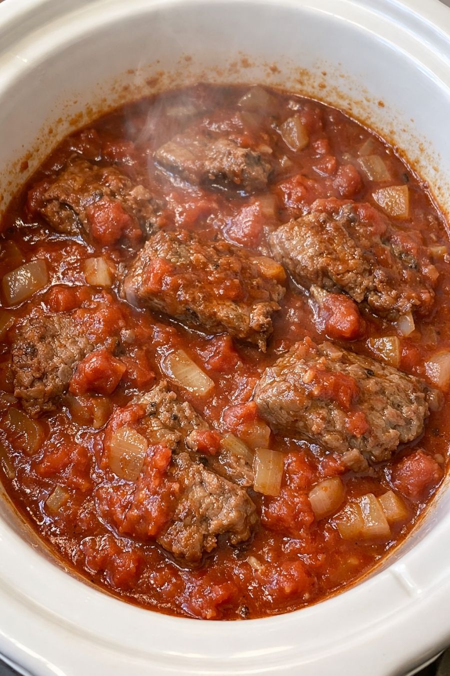 To keep with the spirit of making do with what you have, feel free to adjust this recipe based on your pantry. If you only have whole or crushed canned tomatoes, those work just fine; just break them up a bit with a spoon before mixing with the tomato soup. You can swap in a large sweet onion or even a couple of smaller onions if that’s what you have on hand. For a slightly richer flavor, some families like to brown the meat quickly in a hot skillet before adding it to the slow cooker, but it’s not required for tenderness—the long, slow cooking in the tomato gravy does the heavy lifting.