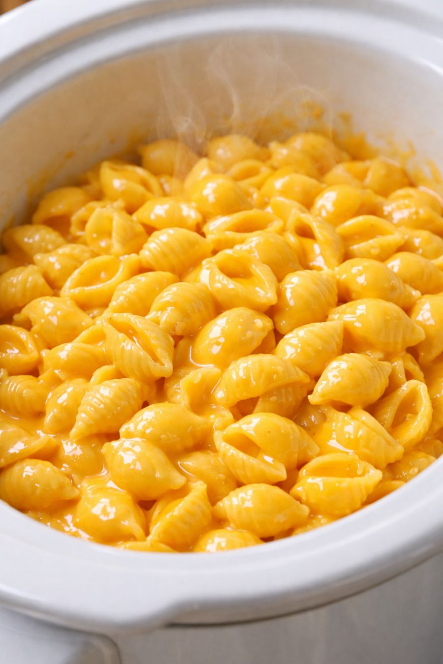 Replace the lid and continue cooking on LOW for another 30 to 60 minutes, stirring every 20 minutes, until the shells are tender and the cheese is fully melted into a smooth, glossy orange sauce. Total cook time is usually about 1 1/2 to 2 hours, depending on your slow cooker.