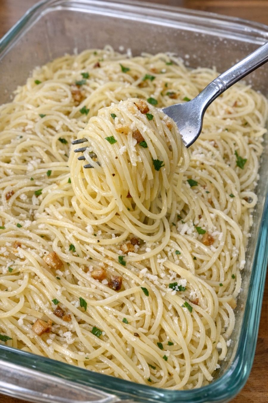 Serve this garlic butter angel hair straight from the glass baking dish with a big fork for twirling. It pairs nicely with a crisp green salad dressed with vinegar and a pinch of sugar, or steamed green beans with a squeeze of lemon to cut through the richness. A simple roasted chicken or baked pork chops make it a full Sunday-style meal, but on busy weeknights, my grandmother often set this on the table with sliced garden tomatoes and a jar of pickles, and no one complained. A little extra grated Parmesan and black pepper at the table never hurt either.