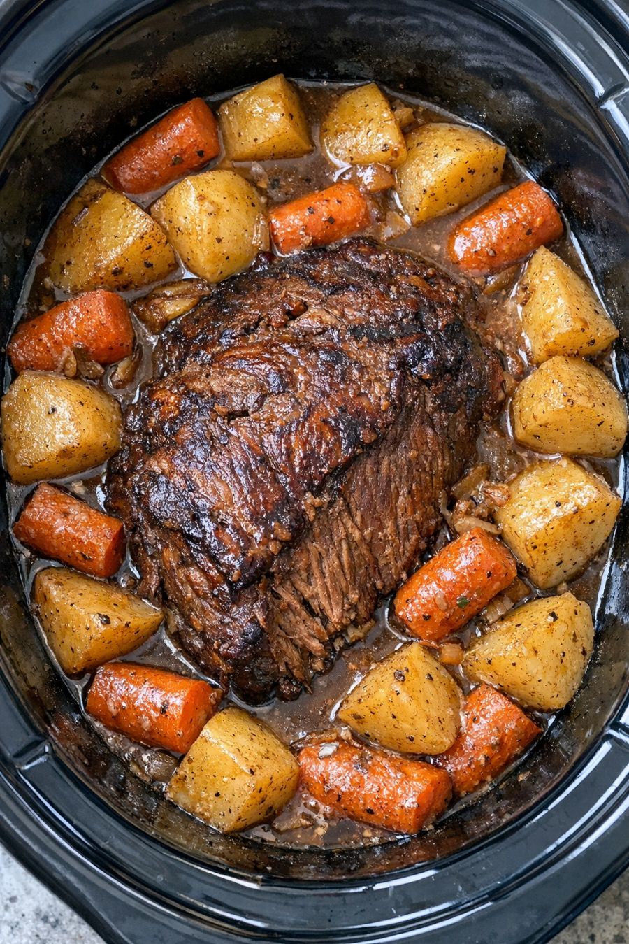 Cover the slow cooker with the lid and cook on LOW for 8 to 10 hours, or until the roast is very tender and easily pulls apart with a fork and the carrots and potatoes are soft and infused with the dark gravy.