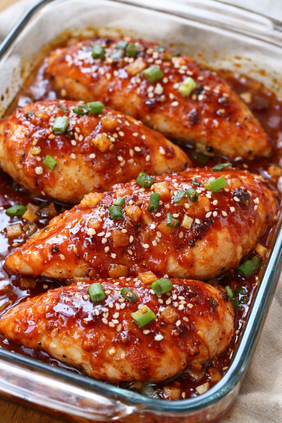 For an extra glossy, slightly caramelized finish, spoon more sauce over the chicken and bake uncovered for an additional 5 minutes. The glaze should cling to the chicken in a shiny, sweet red layer.