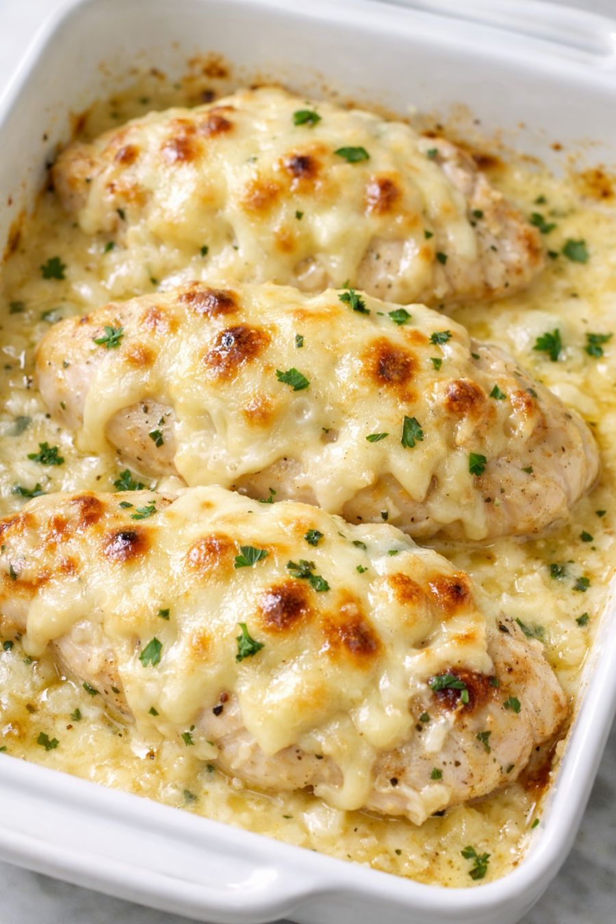 Remove the casserole from the oven and let it rest for about 5–10 minutes. This short rest helps the sauce thicken slightly and makes it easier to serve tidy scoops with plenty of creamy chicken and melted cheese in each spoonful.