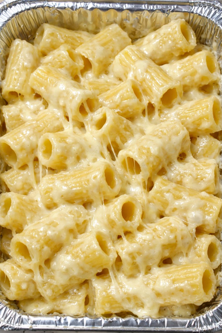 Serve the creamy fontina rigatoni straight from the foil pan, scooping down through the top so you catch the gooey cheese, thick pasta tubes, and rich cream sauce in every portion.