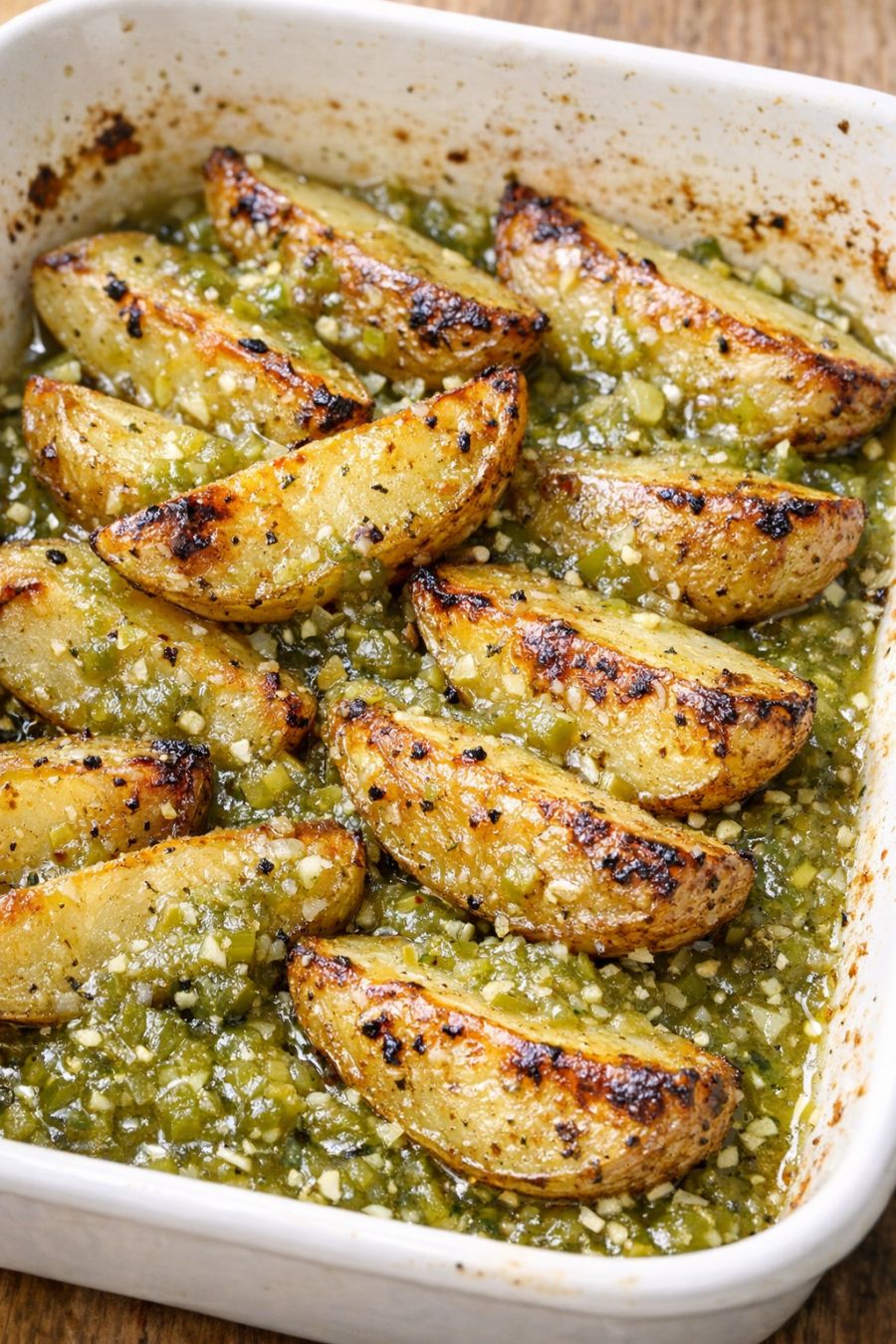 Once done, let the potatoes rest for 5–10 minutes so the bubbling settles and the salsa clings a bit more to the wedges. Serve the potatoes directly from the white casserole dish while they’re hot, making sure to spoon plenty of the bright green salsa over each serving.