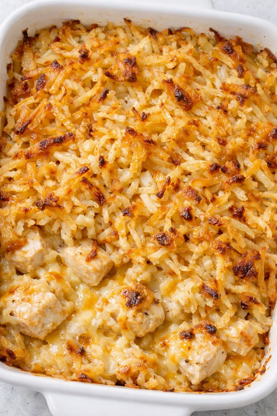 For families with picky eaters, you can swap the cream of chicken soup for cream of mushroom or cream of celery if that’s what you have on hand, but keep in mind it will slightly change the flavor. If your kids prefer milder cheese, use a mild cheddar or a Colby Jack blend instead of sharp cheddar. For a little extra flavor without adding more ingredients, season the chicken with a pinch of garlic powder or paprika along with the salt and pepper. You can also use chicken tenderloins or boneless, skinless chicken thighs cut into bite-size pieces if your family prefers dark meat; just keep the pieces roughly the same size so they cook evenly. If you want the top extra crispy, broil the casserole for 2 to 3 minutes at the end of baking, watching very closely so it doesn’t burn. Food safety tips: Always start with fully thawed hashbrowns so the casserole bakes evenly and the center gets hot enough. Cut the chicken into uniform pieces so all of it reaches 165°F (74°C); use an instant-read thermometer to check a piece from the center of the dish. Do not leave the casserole at room temperature for more than 2 hours after baking; refrigerate leftovers promptly in a shallow container and reheat until steaming hot before serving again. If handling raw chicken, wash your hands, cutting board, and knife with hot, soapy water before moving on to the potatoes and cheese to avoid cross-contamination.
