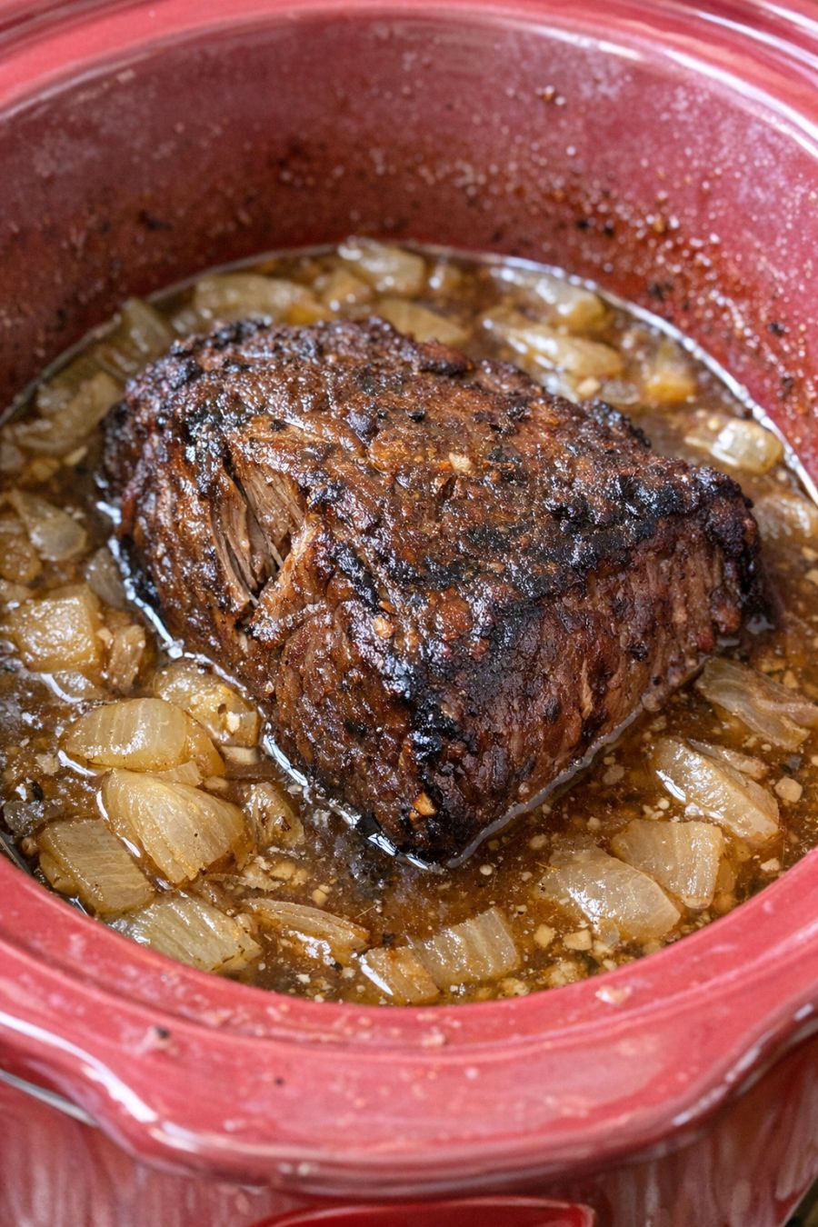 Shred or slice and serve: Transfer the roast back into the slow cooker or to a serving platter. Use two forks to gently pull the meat into large chunks or thick shreds—it should fall apart with almost no effort. Spoon the soft onions and plenty of the rich brown au jus over the top. Serve hot, making sure everyone gets some of the juices and onions with their portion.