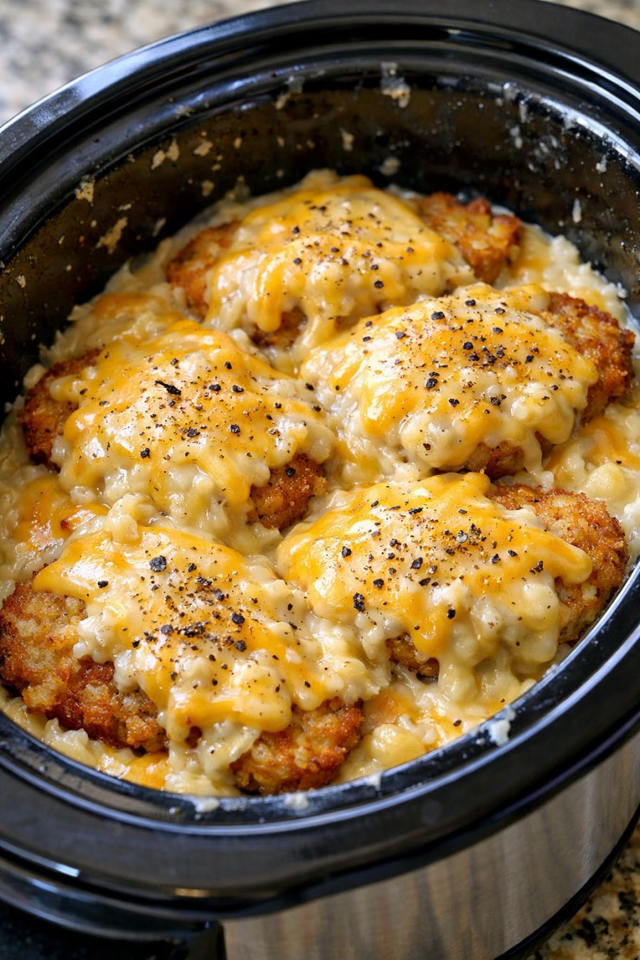 For a vegetarian version, use condensed cream of mushroom or cream of celery soup instead of cream of chicken. If you like a little extra flavor, stir 1/2 teaspoon garlic powder, 1/2 teaspoon onion powder, or a pinch of smoked paprika into the soup mixture before pouring it over the patties. You can also add up to 1 cup of finely diced cooked ham or crumbled cooked bacon on top of the patties before adding the sauce for a heartier main dish. For a sharper flavor, swap part of the cheddar for Monterey Jack, pepper jack, or smoked gouda. If you want a lightly crisped top, transfer the finished potatoes to a broiler-safe dish, sprinkle with the reserved cheese and a few crushed potato chips or buttered breadcrumbs, and broil for 2–3 minutes, watching closely. Food safety tips: Always start with frozen hash brown patties straight from the freezer; do not let them sit at room temperature for long before cooking. Use a food-safe, modern slow cooker, and keep the lid on during cooking so the temperature stays in the safe zone. Leftovers should be cooled quickly, refrigerated within 2 hours, and eaten within 3–4 days. Reheat leftovers until steaming hot in the center (165°F/74°C) before serving.