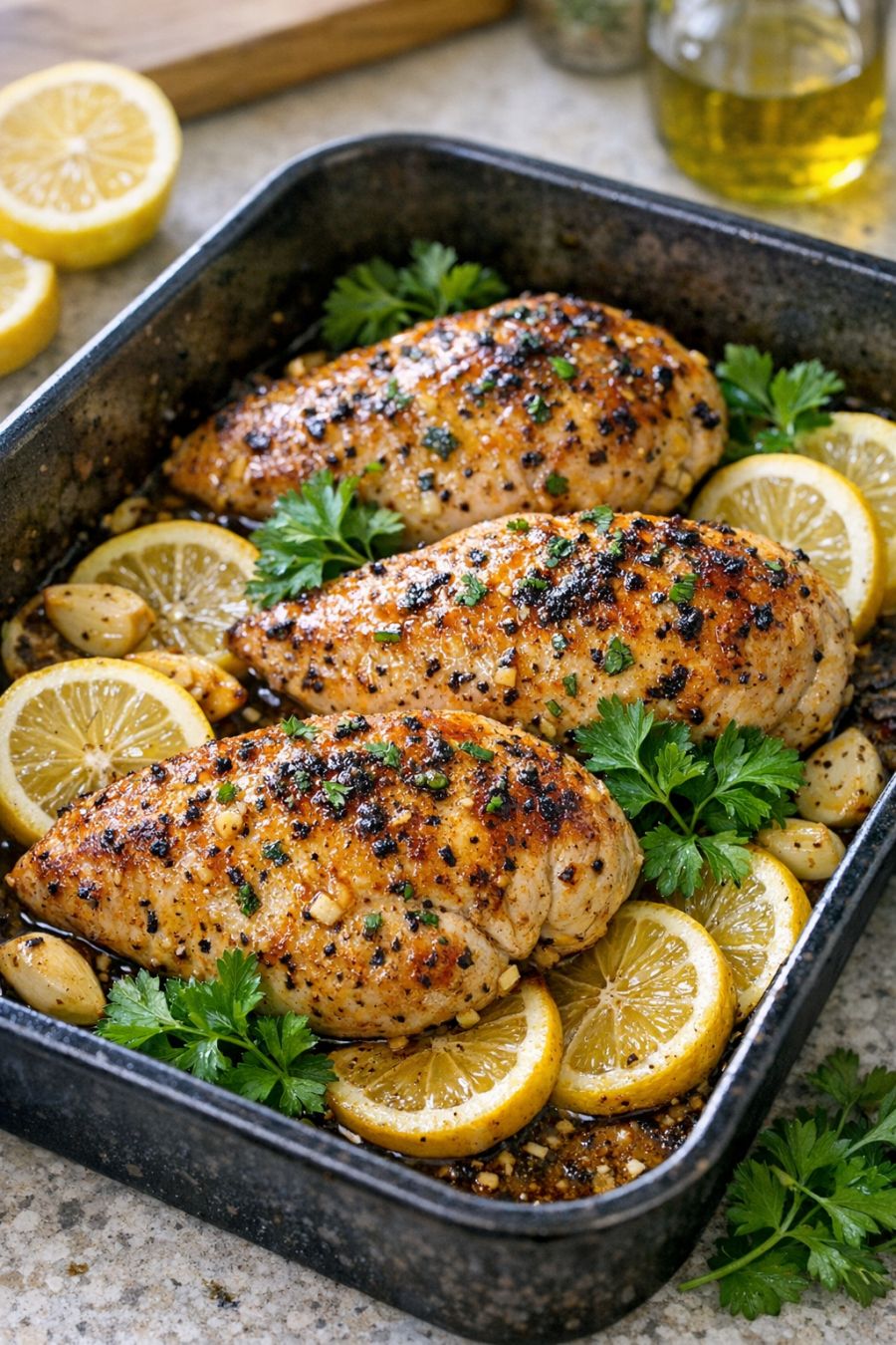 This oven baked 5-ingredient lemon herb chicken is exactly the kind of weeknight dinner I lean on when work runs late and I still want something that feels a little special. You literally drizzle a store-bought lemon pepper marinade and four simple pantry ingredients over raw chicken breasts in a roasting pan, slide it into the oven, and let the heat do all the work. The flavors are bright and zesty from the lemon, with just enough herbs and garlic to make the kitchen smell like you’ve been cooking all afternoon (even though it took you about 10 minutes). It’s a modern, shortcut version of classic lemon herb chicken—perfect for busy nights in the suburbs when you’re juggling a lot but still want a home-cooked meal.