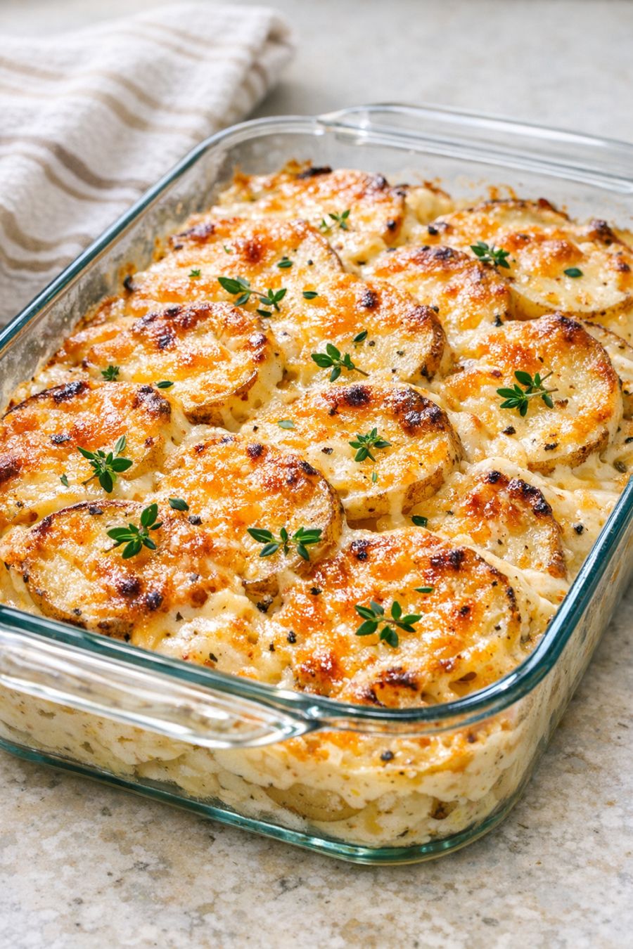 Let the scalloped potatoes rest for at least 10–15 minutes before serving. This short rest helps the creamy sauce thicken and makes it easier to scoop neat portions. Serve warm, straight from the glass casserole dish.