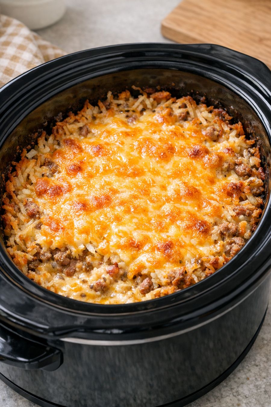 Fill the slow cooker: Spoon the hash brown mixture into the greased slow cooker and spread it into an even layer, pressing down lightly so there are no big air pockets. Smooth the top so it cooks evenly and browns nicely around the edges.