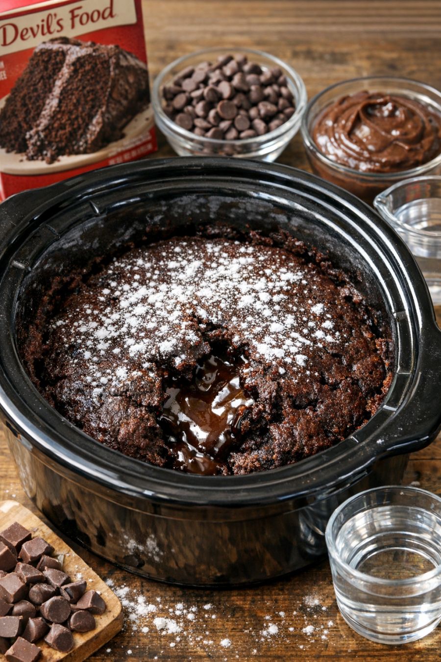 Serve this lava cake warm, scooped straight from the slow cooker into small ramekins or bowls so the gooey chocolate center can ooze out. Dust the tops with powdered sugar to mimic that pretty, bakery-style finish, or add a scoop of vanilla ice cream or a dollop of whipped cream for contrast against the warm, rich chocolate. Fresh berries like raspberries or strawberries on the side help cut through the sweetness, and a cup of coffee or a small glass of cold milk pairs perfectly. If you’re entertaining, you can pre-portion the warm cake into white ramekins, sprinkle with powdered sugar, and set them on a rustic wooden board for a cozy, from-scratch look with almost no extra effort.