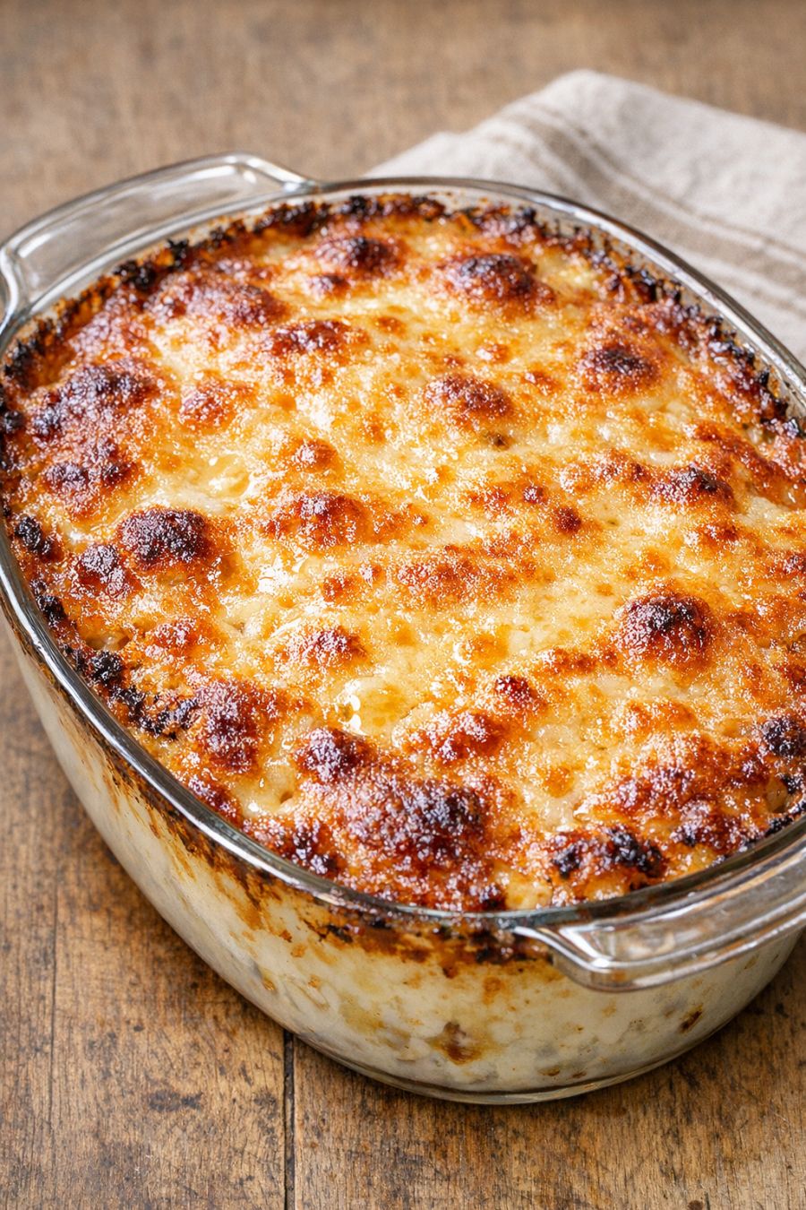 After 1 1/2 hours, carefully remove the foil and increase the oven temperature to 375°F (190°C). Continue baking, uncovered, for 25 to 35 minutes, or until the casserole is bubbling all over and the cheese on top is deep golden brown with caramelized edges where it meets the sides of the dish and glossy patches of melted cheese across the surface.
