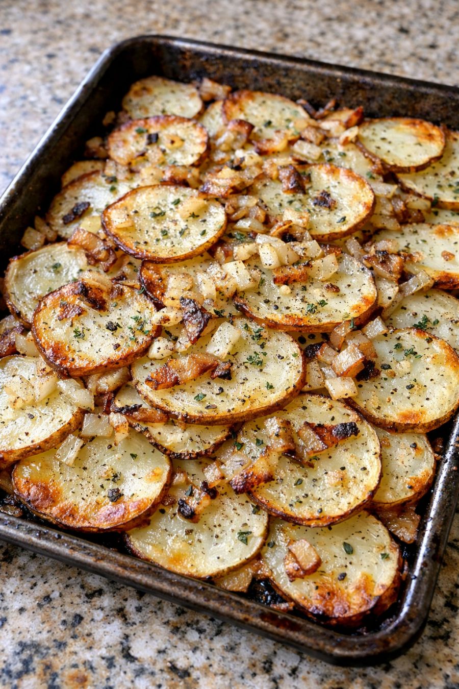 Taste a potato slice and add a pinch more seasoned salt if needed. Let the sheet pan rest for 5 minutes so the potatoes firm up slightly and are easier to serve. Slide a wide spatula under the overlapping rows and transfer the potatoes and onions to plates or a serving platter, keeping the shingled look as much as possible.