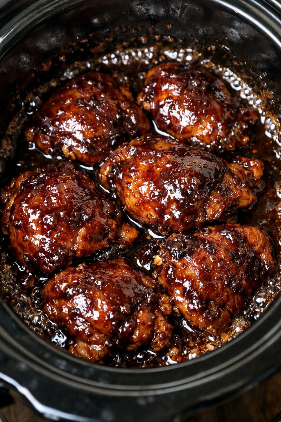 Once the chicken is cooked through (internal temperature at least 165°F in the thickest part, not touching bone), switch the slow cooker to WARM. If you’d like the glaze extra thick and sticky, spoon some of the sauce from the bottom over the tops of the thighs, then let it sit uncovered on WARM for about 10–15 minutes to reduce slightly.