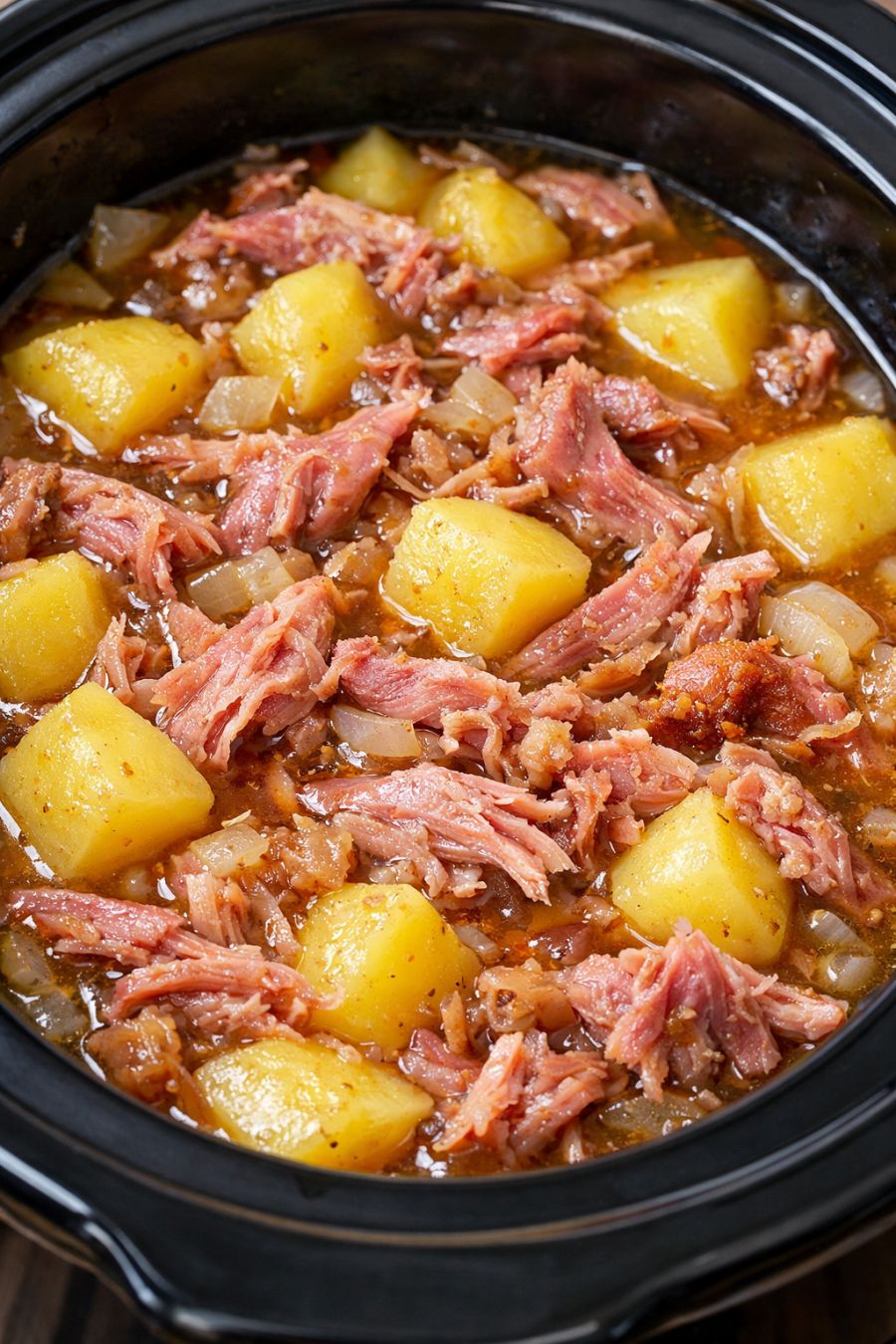 Return the shredded ham to the slow cooker and gently stir it into the potatoes and onions. At this point, taste the broth before adding any seasoning—the smoked ham hock can be quite salty on its own.