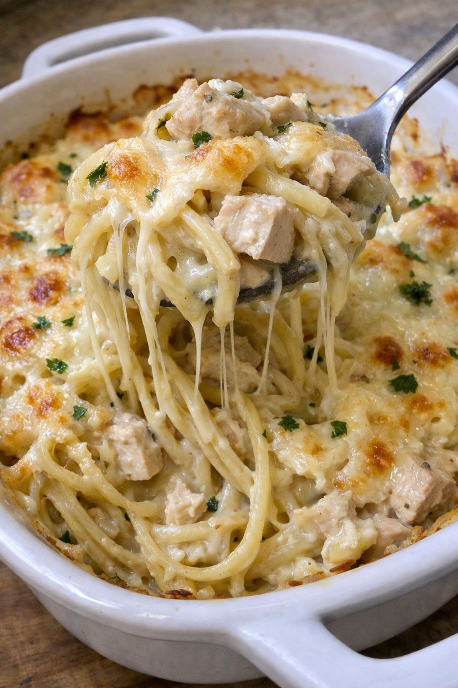Let the tetrazzini rest on the counter for 10 minutes before serving. This helps the sauce thicken slightly so you can scoop out big, generous portions without it sliding all over the place. Serve straight from the dish with a large spoon, making sure to get some of the stretchy top cheese with every serving.