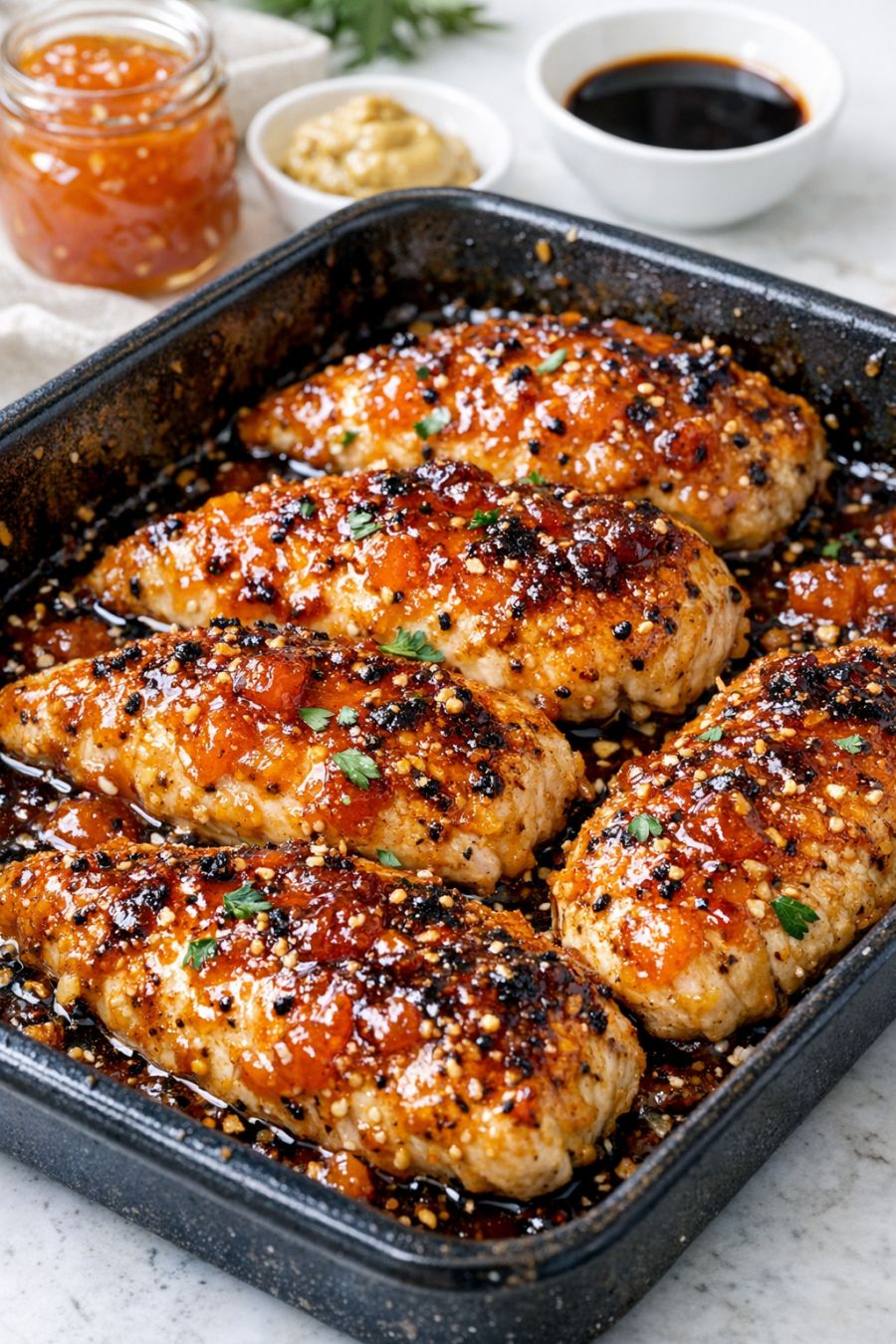 Place the roasting pan on the center rack of the preheated oven. Bake for 45–55 minutes, basting once or twice with the pan juices and any glaze that slides off, until the chicken skin is deep golden and the thickest part of the meat reaches an internal temperature of 165°F (74°C).