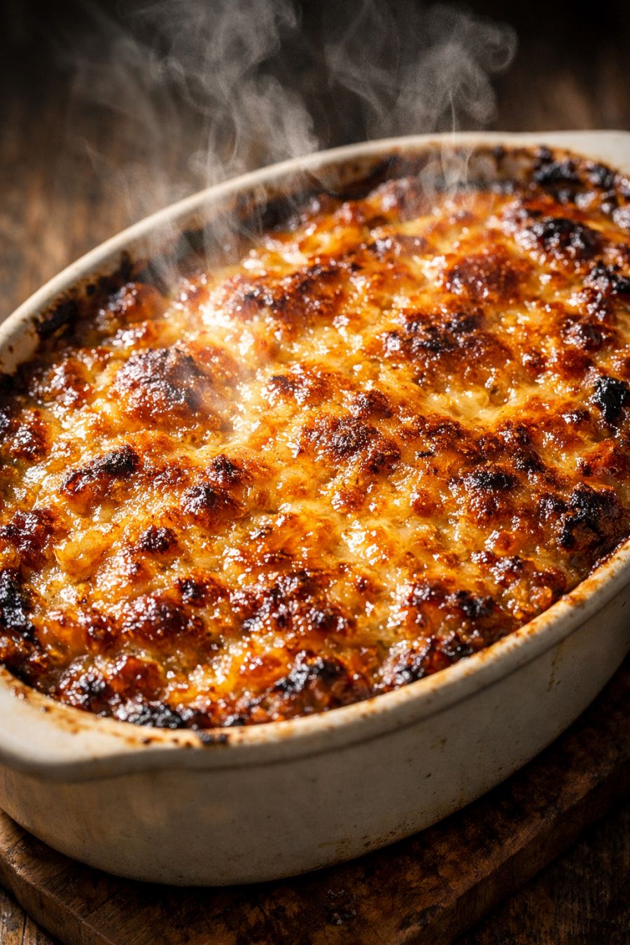 Place the dish on the center rack and bake for 25–30 minutes, or until the edges are deeply golden, the top is bubbling in spots with little pools of cheese and rendered fat, and you can see some caramelized, slightly charred bits around the rim. If you like it extra browned, you can bake an additional 5 minutes, watching closely.