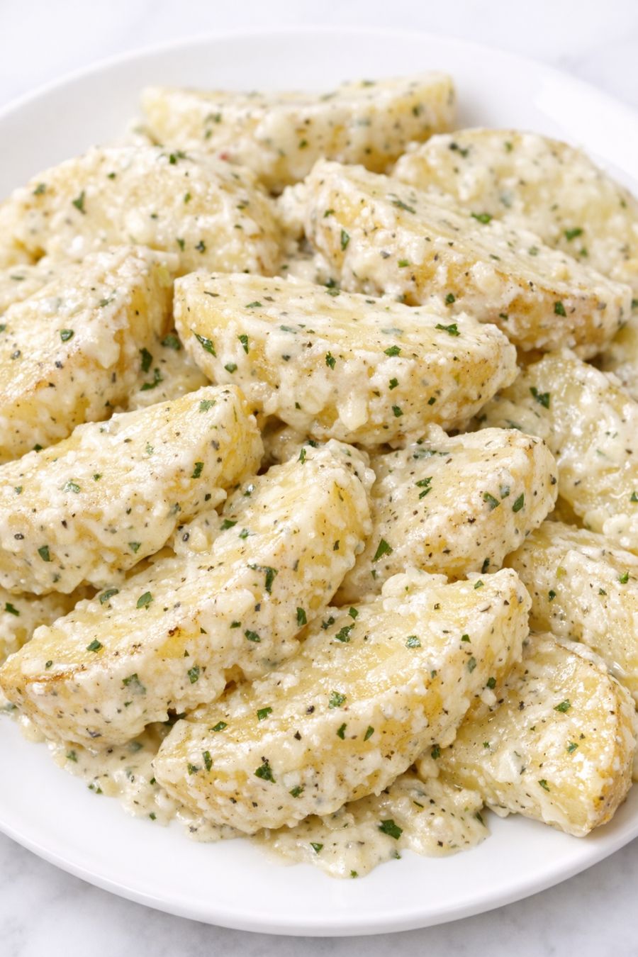 Serve the potatoes hot, spooning them onto plates so each serving has tender pale yellow wedges coated in the creamy, seasoned sauce with visible herb flecks and a soft, buttery texture.
