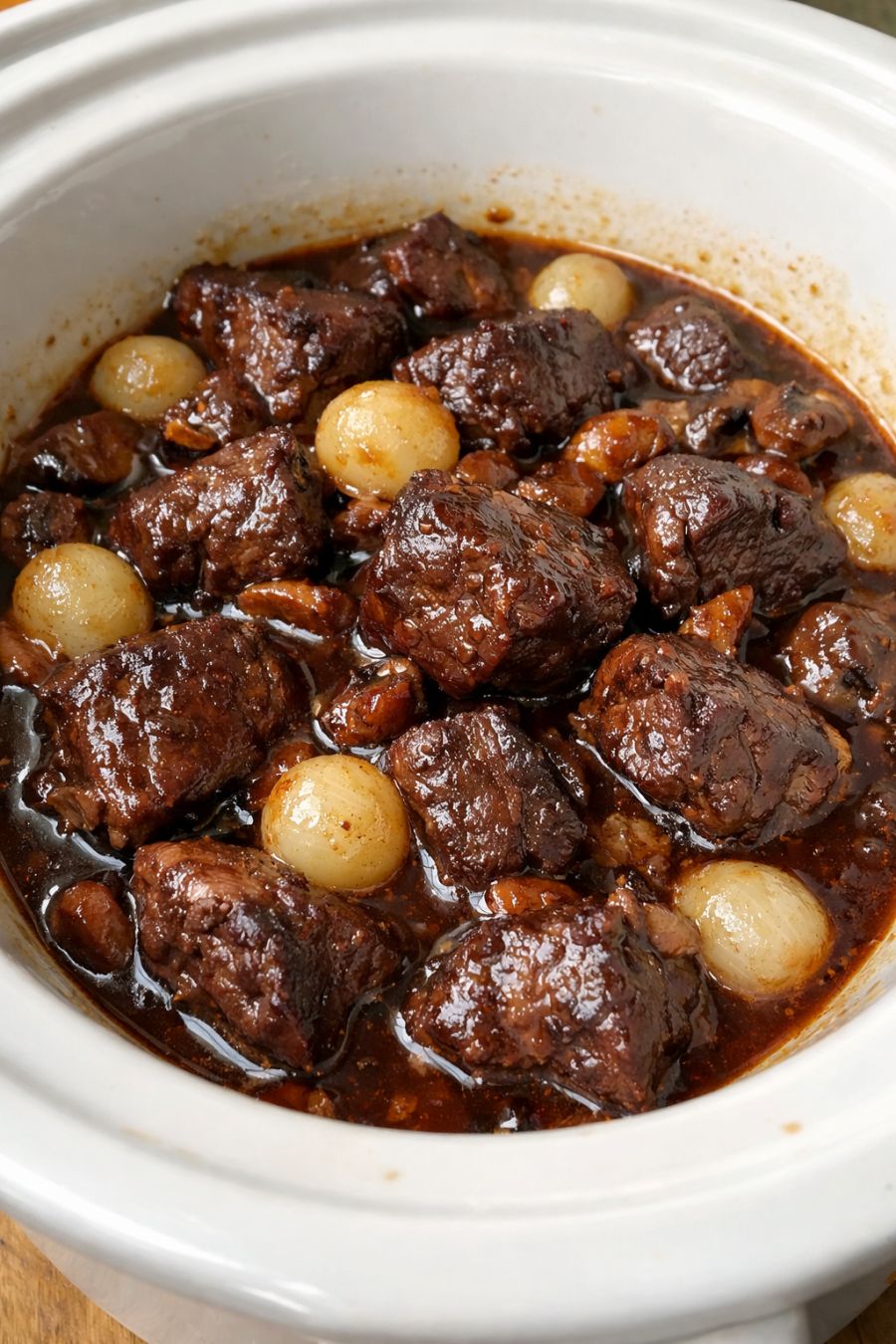 Adjust seasoning and serve: Taste the sauce and add a bit more salt and pepper if needed. If you’d like the sauce thicker, remove the lid for the last 20 to 30 minutes of cooking on HIGH to let it reduce slightly, or mash a few pieces of onion into the sauce to naturally thicken it. Serve the beef and pearl onions with plenty of the rich wine gravy spooned over your favorite starch.
