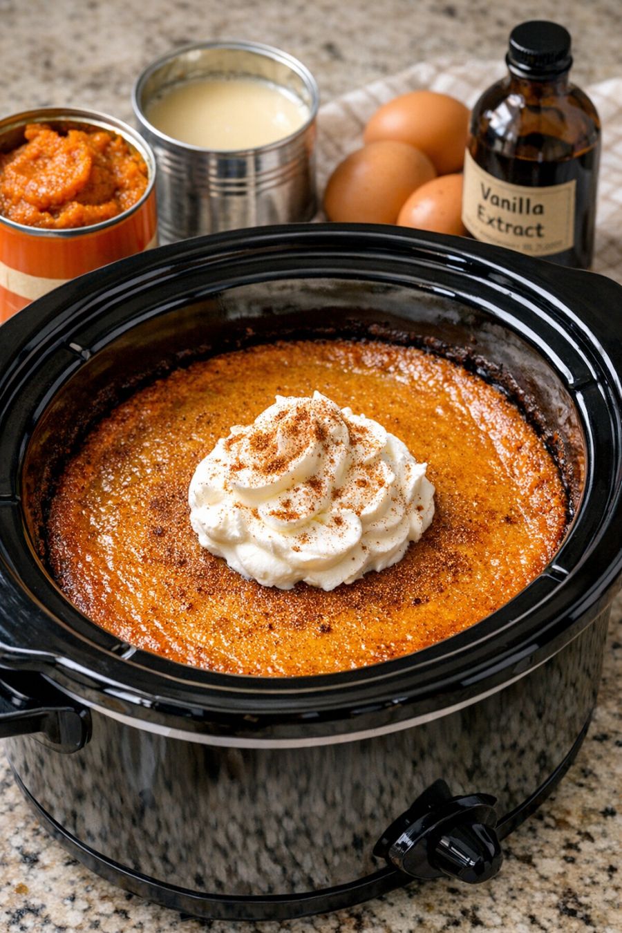 For a lighter sweetness, replace half of the sweetened condensed milk with an equal amount of evaporated milk, understanding this technically adds a fifth ingredient but keeps the same easy method. If your family prefers milder spice, cut the pumpkin pie spice down to 1 teaspoon or use only cinnamon. For kids who like a little fun crunch, sprinkle mini chocolate chips or crushed graham crackers over the top just before serving. You can also stir in 1 teaspoon of vanilla extract with the custard mixture for a deeper, old-fashioned flavor, or add a pinch of salt to balance the sweetness. If you need a dairy-reduced version, use canned coconut sweetened condensed milk, but be aware the flavor will be slightly different and a bit more tropical. For individual portions, you can pour the custard mixture into small heat-safe ramekins, place them in the slow cooker, and add about 1 inch of hot water around them to create a water bath; cooking time may be slightly shorter, so start checking at 2 1/2 hours. Food safety tips: Always use pasteurized eggs and keep them refrigerated until you’re ready to mix. Make sure the custard reaches at least 160°F in the center to ensure the eggs are fully cooked; an instant-read thermometer is helpful here. Once the dessert has cooled, refrigerate leftovers within 2 hours and store them covered in the fridge for up to 3 days. Reheat gently in the microwave or enjoy cold like a soft pumpkin pudding.