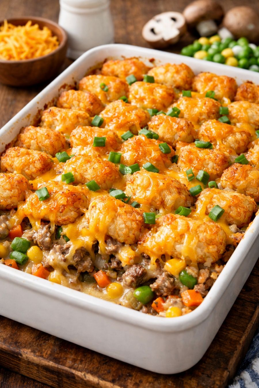 Let the casserole rest for 5–10 minutes before serving so the filling thickens slightly and slices hold together better. Serve hot, scooping down through the crispy tots to get plenty of beef, vegetables, and sauce in each portion.