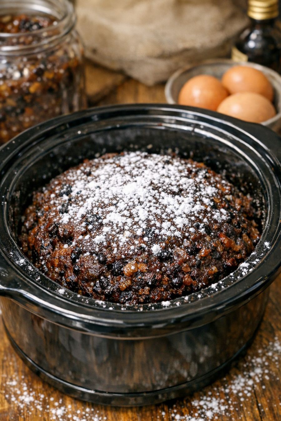 Grease the inside of your slow cooker crock with soft butter or nonstick spray, making sure to coat the bottom and about halfway up the sides. This helps the pudding release easily and reduces sticking.