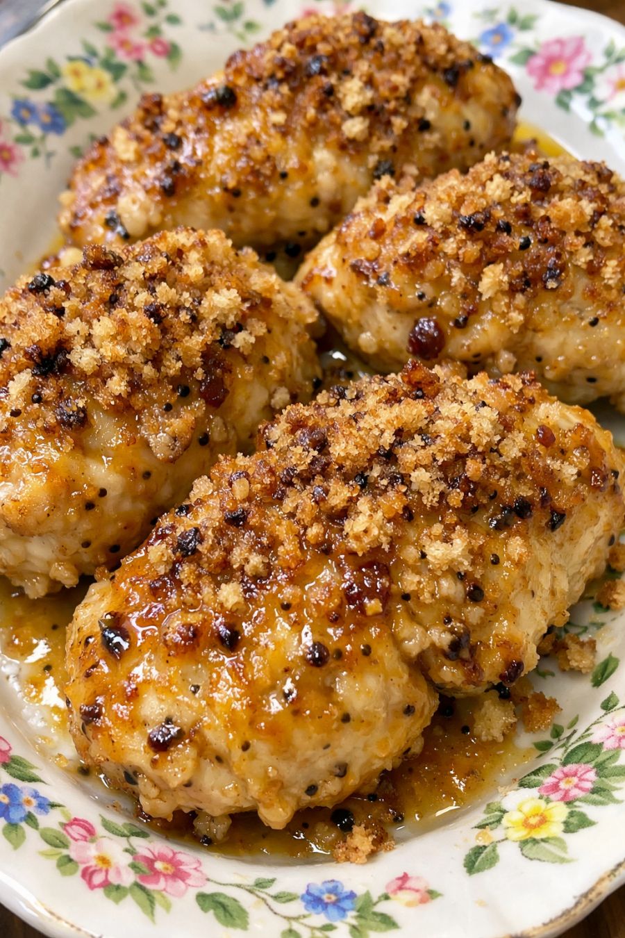 Serve this deviled chicken straight from the oven while the breadcrumb crust is still crisp and the mustard glaze is glossy. It pairs well with simple sides that won’t compete with the tangy coating: buttered egg noodles, roasted potatoes, or a pot of plain white or brown rice to catch the drippings. A crisp green salad with a light vinaigrette or steamed green beans with a squeeze of lemon helps balance the richness. If you’d like a more nostalgic, Midwestern-style plate, add coleslaw and dinner rolls to round things out.