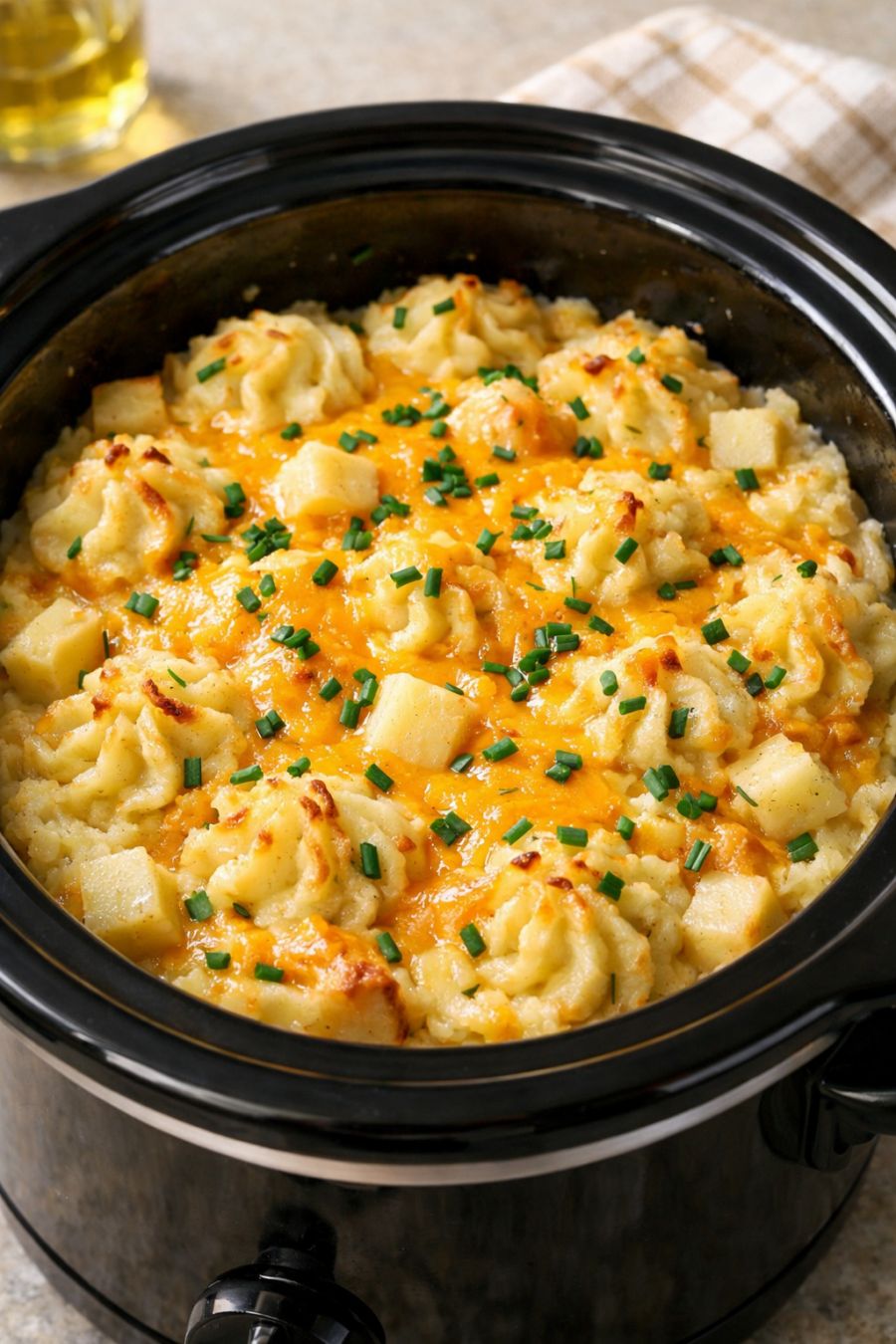 For picky eaters, you can skip the chives on top and use a milder cheese like Colby Jack or mozzarella so the flavor is more familiar and gentle. If your family loves garlic, add 2 to 3 cloves of minced garlic or 1 teaspoon of garlic powder on top of the potatoes before cooking, or stir in roasted garlic at the mashing stage for a deeper, sweeter flavor. For a little extra richness on holidays, swap half of the heavy cream for room-temperature cream cheese and mash it in with the butter. If you prefer a lighter version, you can use half-and-half instead of heavy cream and reduce the cheese to 1 cup total; the potatoes will be a bit less rich but still creamy. To make them feel even more like traditional duchess potatoes, you can scoop the finished potatoes into a buttered baking dish, swirl the top with a spoon, and broil for a few minutes until lightly browned and crisp around the edges—just be sure to transfer them carefully and watch closely under the broiler. For make-ahead prep, you can peel and cube the potatoes up to 4 hours in advance and keep them covered in cold water in the fridge, then drain well before adding to the slow cooker. Food safety tips: Always cook the potatoes until they are fully tender and steaming hot in the center; undercooked potatoes can be unpleasant and unsafe. Keep the slow cooker on WARM (not OFF) if you’re serving over a couple of hours, and refrigerate leftovers within 2 hours of cooking in shallow containers. Reheat leftovers thoroughly until steaming hot, adding a splash of cream or milk to loosen if needed, and do not reheat more than once. Avoid leaving dairy-based dishes like this out at room temperature for extended periods, especially at potlucks or holiday gatherings.