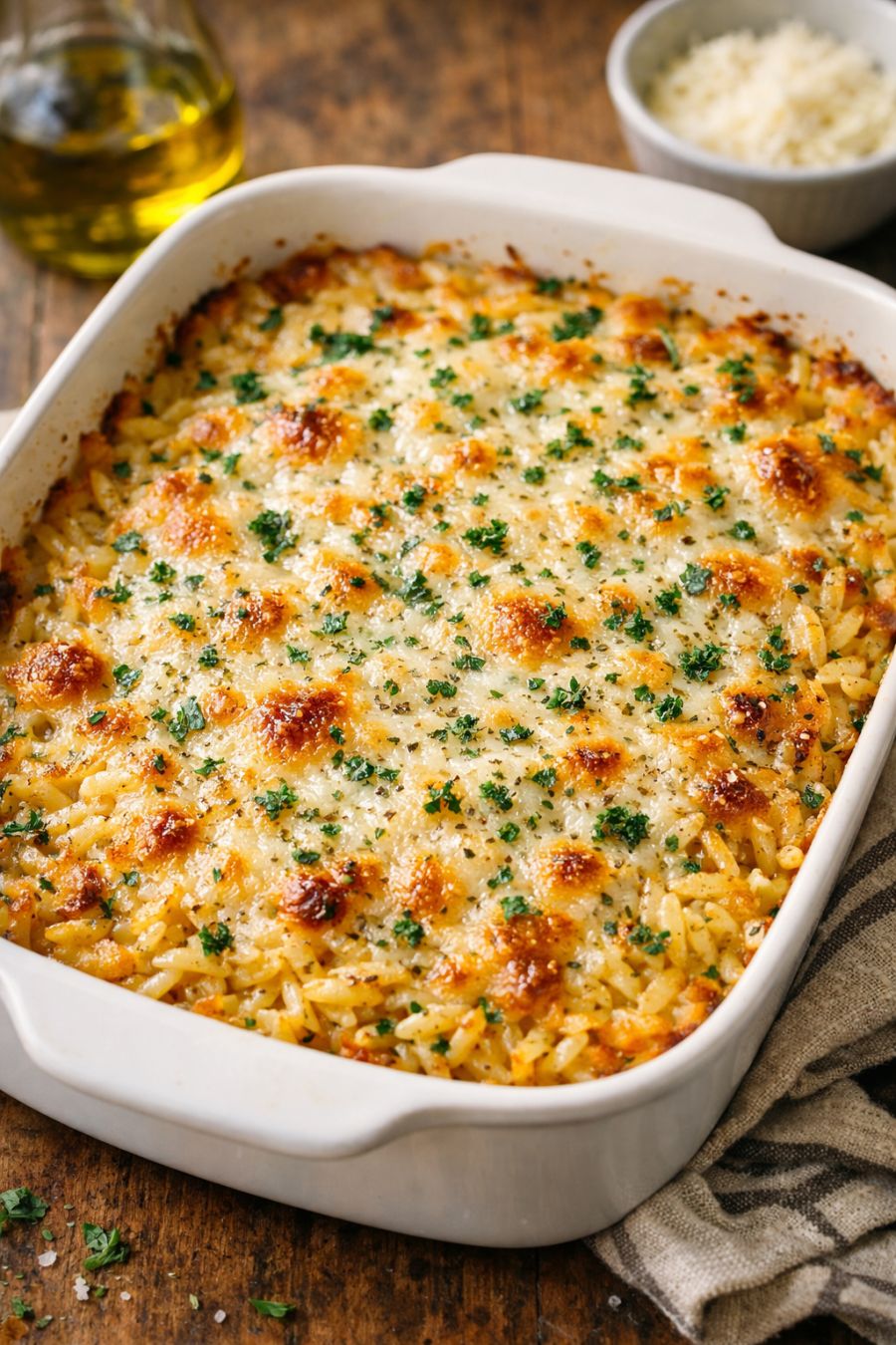 Serve this herbed Parmesan orzo warm, straight from the casserole dish, with a simple green salad or steamed broccoli on the side. It also pairs nicely with roasted or grilled chicken, pork chops, or baked fish. For a heartier meal, you can stir in some shredded rotisserie chicken or chopped ham after baking and return it to the oven for a few minutes to heat through. A squeeze of lemon over each serving brightens the flavors, and a little extra grated Parmesan on top never hurts.