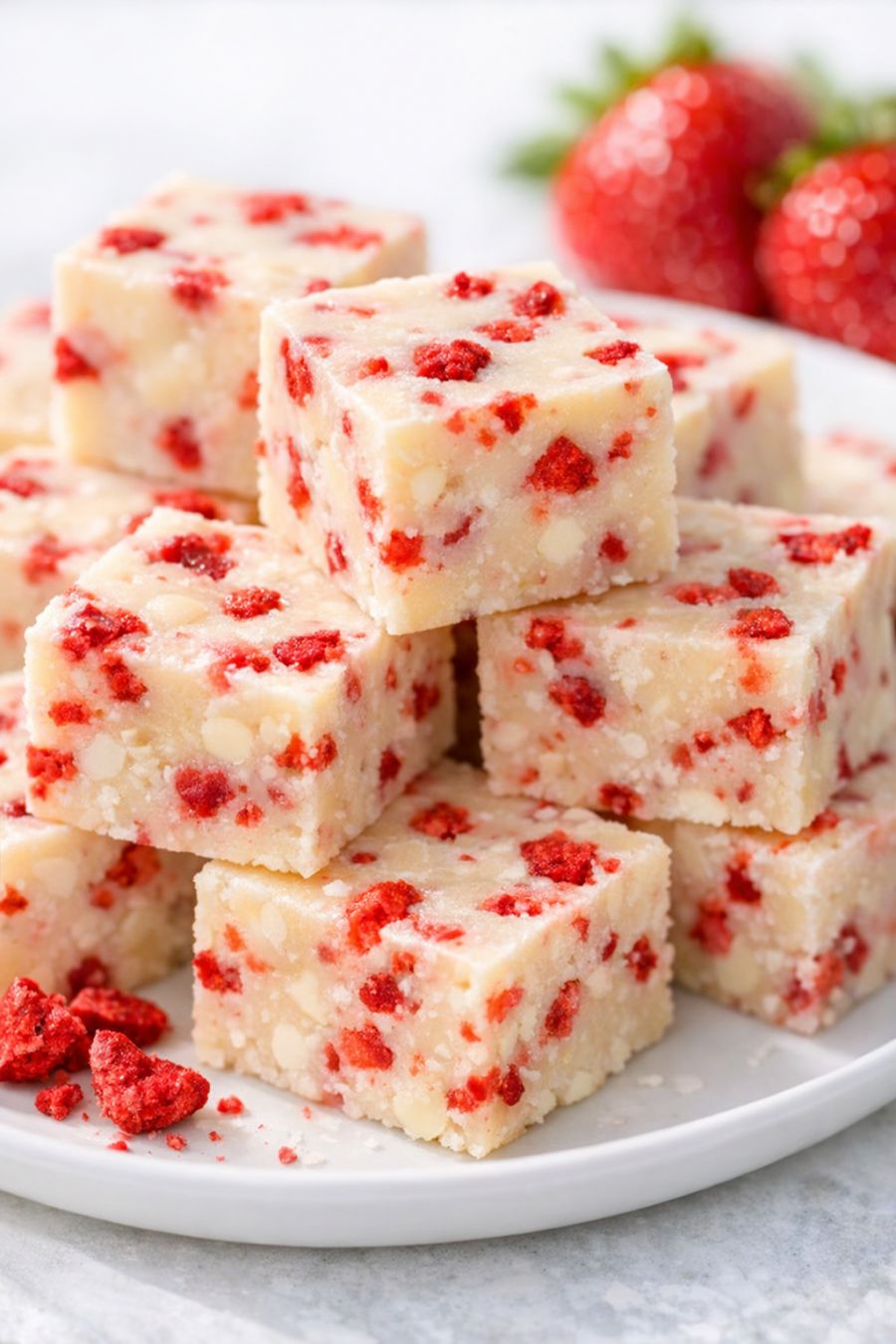 Store the strawberry fudge in an airtight container in the refrigerator for up to 5–7 days. For the best texture and flavor, let the pieces sit at room temperature for about 5–10 minutes before serving so they soften slightly.