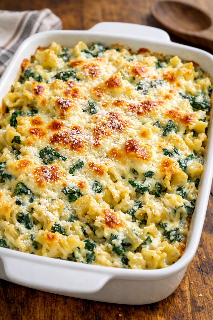 For a heartier version, stir 1 to 2 cups of cooked, shredded chicken, rotisserie turkey, or diced ham into the pasta after the first covered bake, then top with the remaining cheese and finish baking. To keep it vegetarian, simply use vegetable broth instead of chicken broth. If you like a bit of tang, sprinkle 1/4 cup of grated Parmesan over the mozzarella before the final bake. For extra color and nutrition, you can add 1 to 2 cups of thawed frozen peas or a handful of chopped jarred roasted red peppers when you stir the pasta midway through baking. If you prefer a lighter dish, swap the heavy cream for half‑and‑half and use a reduced‑fat spinach artichoke dip, keeping in mind the sauce may be slightly thinner. For a crunchy topping, mix 1/2 cup breadcrumbs with a tablespoon of melted butter and a little garlic powder, then sprinkle over the cheese before the final bake. Food safety tips: Keep the spinach artichoke dip refrigerated until you’re ready to assemble the dish, and don’t leave the finished casserole at room temperature for more than 2 hours; refrigerate leftovers promptly in shallow containers. Reheat leftovers to at least 165°F (74°C) before eating, adding a splash of broth or cream if the pasta seems dry. If you substitute raw meats, such as uncooked chicken, cut them into small pieces and ensure the internal temperature reaches 165°F (74°C); you may need to extend the covered baking time by 10–15 minutes and check doneness with a thermometer.